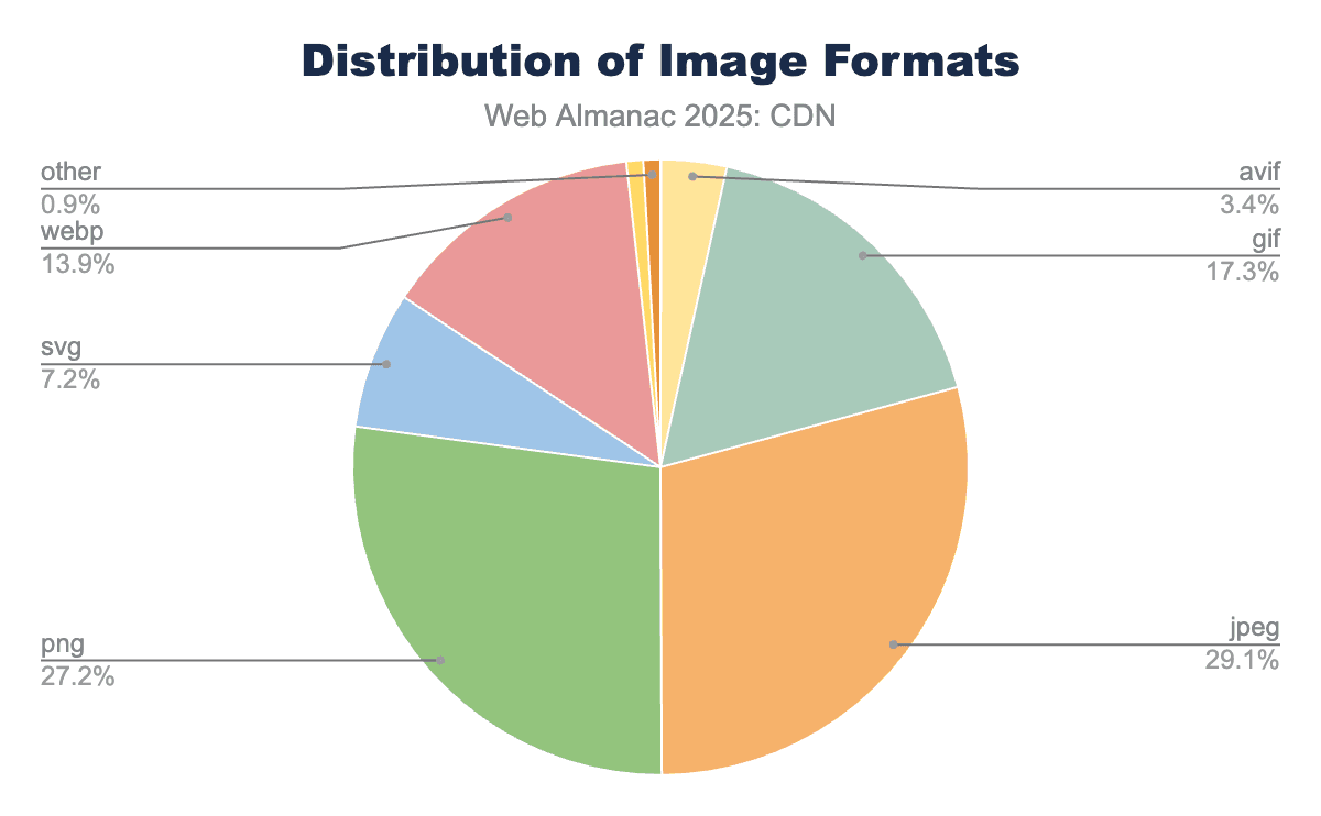 The 2025 data underscore a clear trajectory: legacy formats like JPEG still dominate total requests but are gradually ceding share to newer, more efficient formats. WebP, SVG, and AVIF are becoming the new baseline for high performance content delivery, especially in mobile-first ecosystems where latency and bandwidth efficiency are critical.