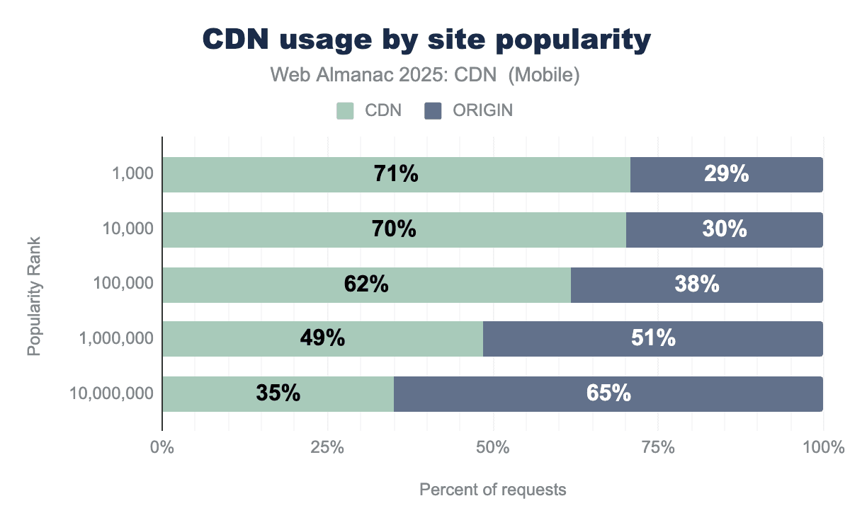 As mentioned in previous editions, the increase in CDN usage of 33% in 2024 to 35% in 2025 among smaller sites can be attributed to the rise of free or flat-tiered or affordable CDN options. Additionally, many hosting solutions now bundle CDNs with their services, making it easier and more cost-effective for websites to leverage this technology.