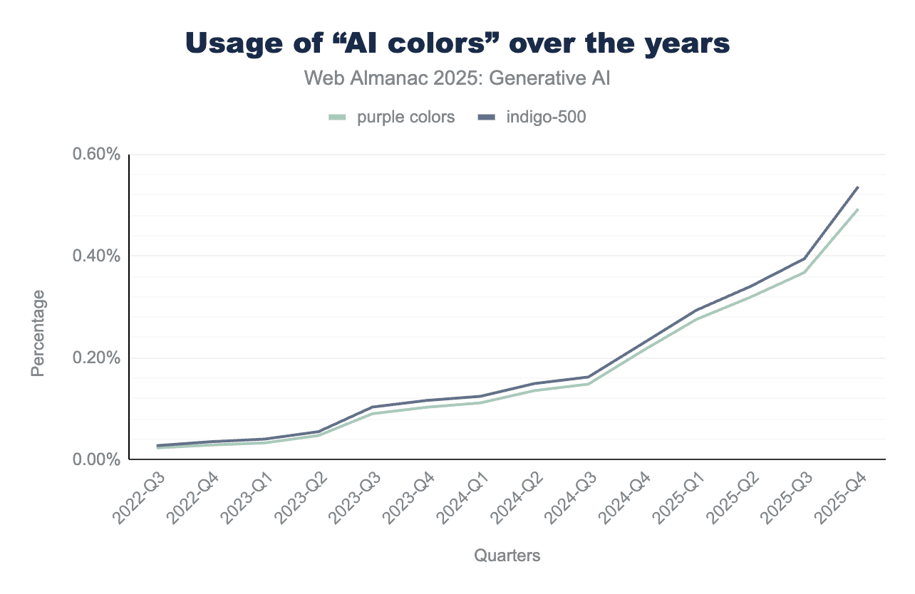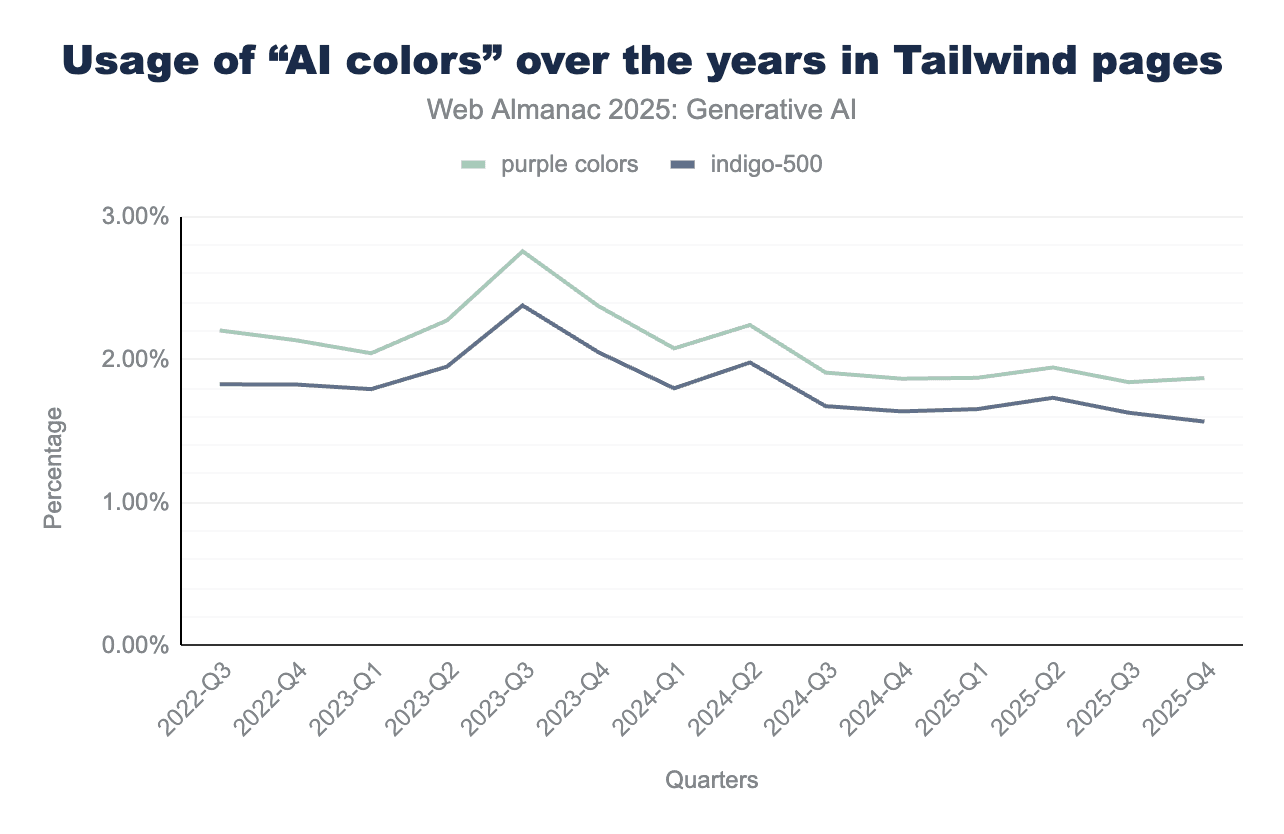 Despite the frequent online discourse regarding “AI slop” and purple-tinted designs, our analysis of the HTTP Archive dataset suggested that this trend may be less a result of AI “choosing” purple and more a reflection of the general rise in Tailwind’s popularity.