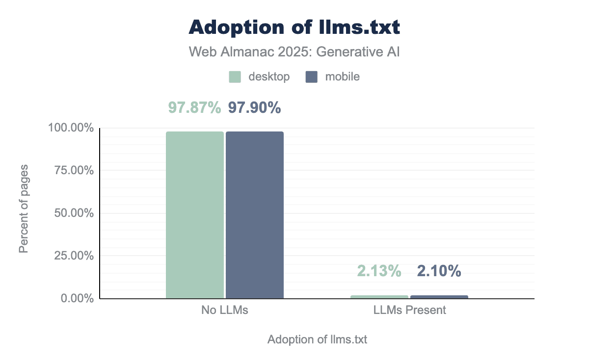 llms.txt. The file is only present on 2.13% of desktop and 2.1% of mobile sites, and absent on the vast majority of 97.87% desktop and 97.9% of mobile sites.llms.txt adoption.