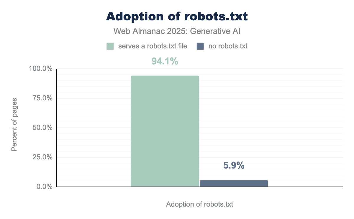 Usage of robots.txt remains highly prevalent: approximately 94.1% of the ~12.9 million sites analyzed include a robots.txt file with at least one directive.