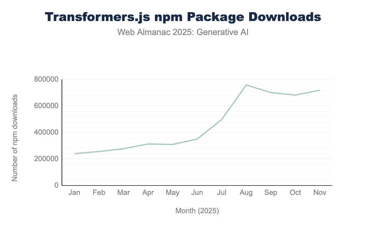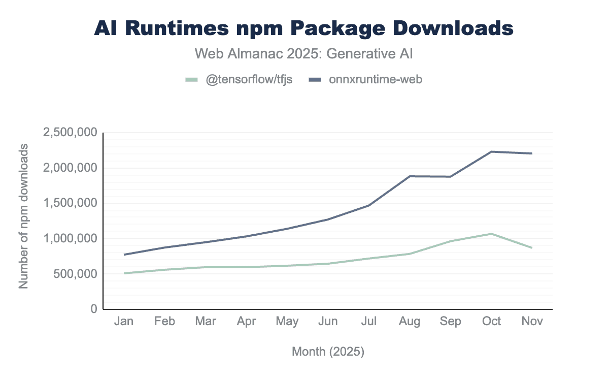 From January to November 2025, npm package downloads of ONNX Runtime increased by 185%, while TensorFlow.js’s downloads increased by 70%, demonstrating strong and growing developer interest in browser-based AI.
