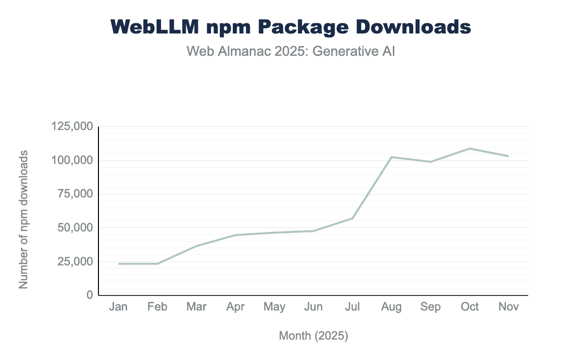 WebLLM has quickly become one of the most prominent solutions for in‑browser LLM inference. Between January and November 2025, WebLLM package downloads from npm increased by 340%. In August alone, the downloads numbers nearly doubled. We were unable to attribute this surge to a specific event.
