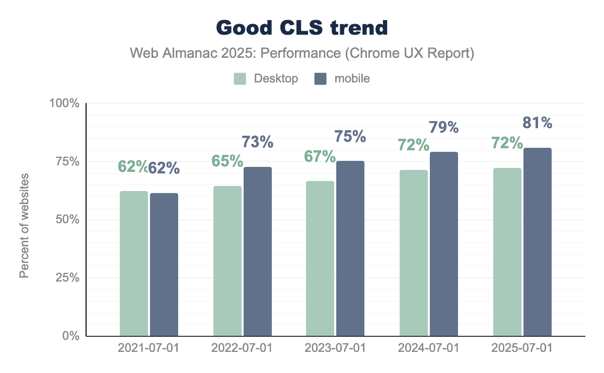 Visual stability is measured by Cumulative Layout Shift (CLS) and is an indicator of how predictable and smooth pages feel to users. This section focuses on highlighting progress, device differences, and shifts over the recent years.