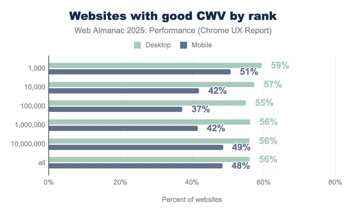Notably, the mobile-desktop performance gap has begun to narrow, shrinking from 23 percentage points in 2024 to 20 percentage points in 2025. While a 20 percentage point gap remains substantial, this marks the first measurable step toward closing the divide. The trend demonstrates that mobile optimization efforts are gaining traction across the web.