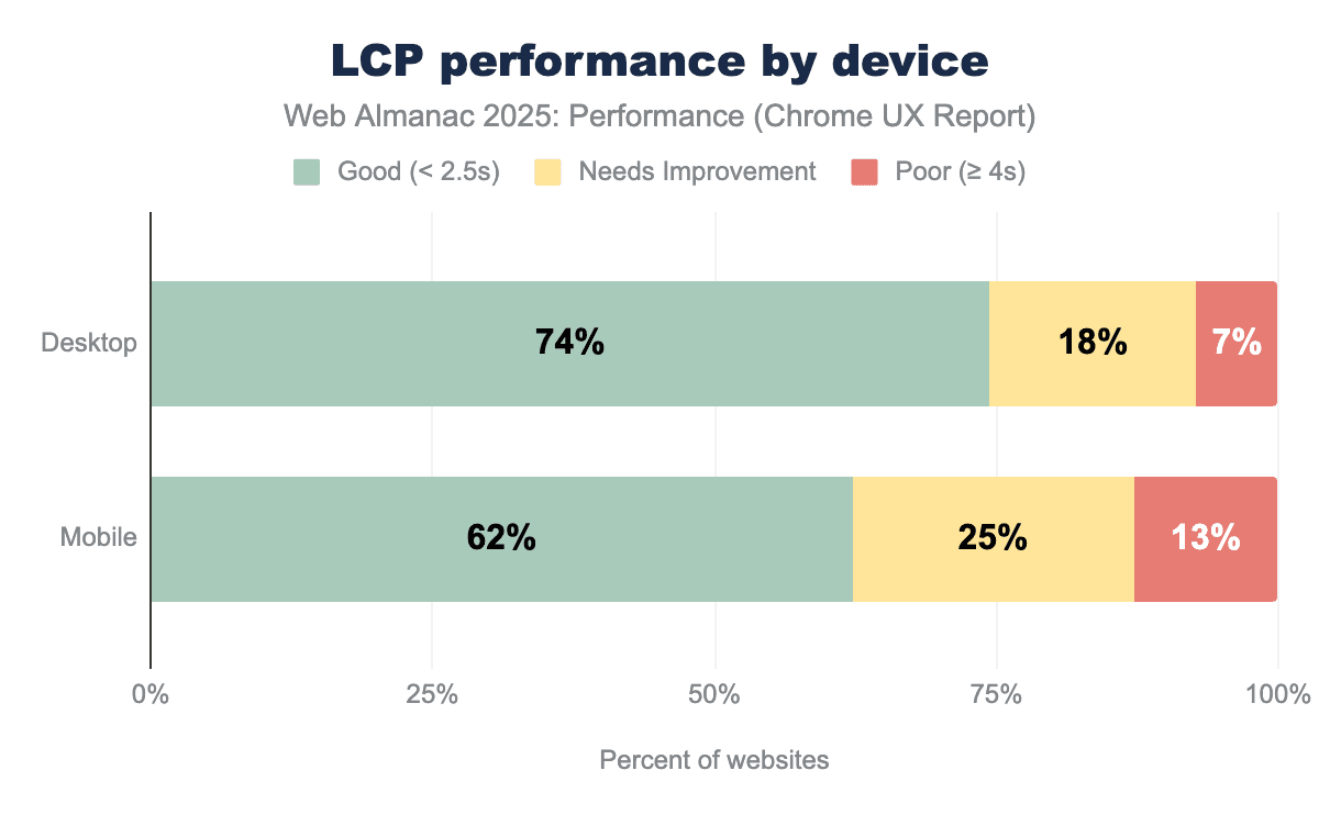 Currently, 74% of desktop pages achieve a “good” LCP score compared to 62% on mobile, with mobile also showing nearly double the rate of “poor” experiences (13% versus 7%); a gap that is consistent with the combined effects of slower networks and less capable devices on mobile.