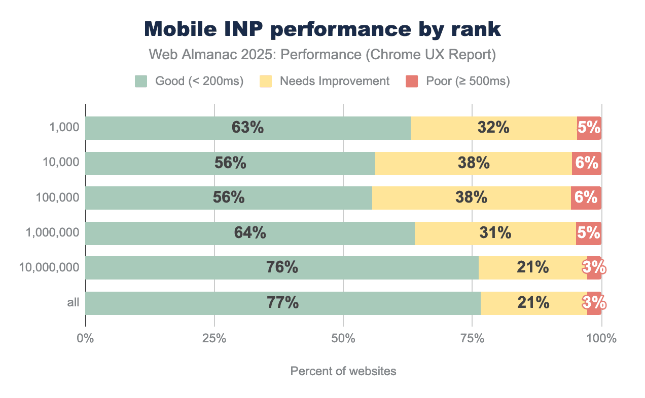 This pattern reflects the unique challenges faced by high-traffic websites: more complex functionality, richer interactive features, heavier third-party integrations, and diverse user interaction patterns. E-commerce platforms, social media sites, and news portals inherently require more JavaScript execution than simpler websites, making good INP scores harder to achieve.