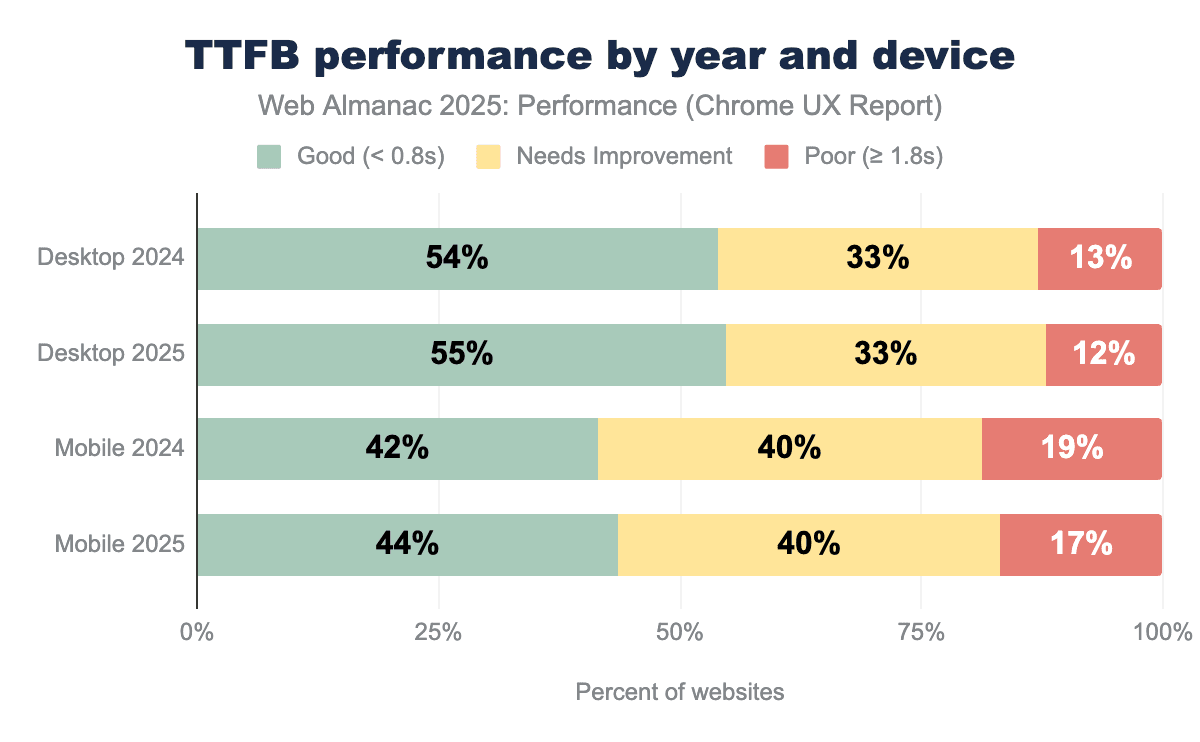 Since 2024, the share of sites achieving a “Good” TTFB increased by 1% on desktop and by 2% on mobile.