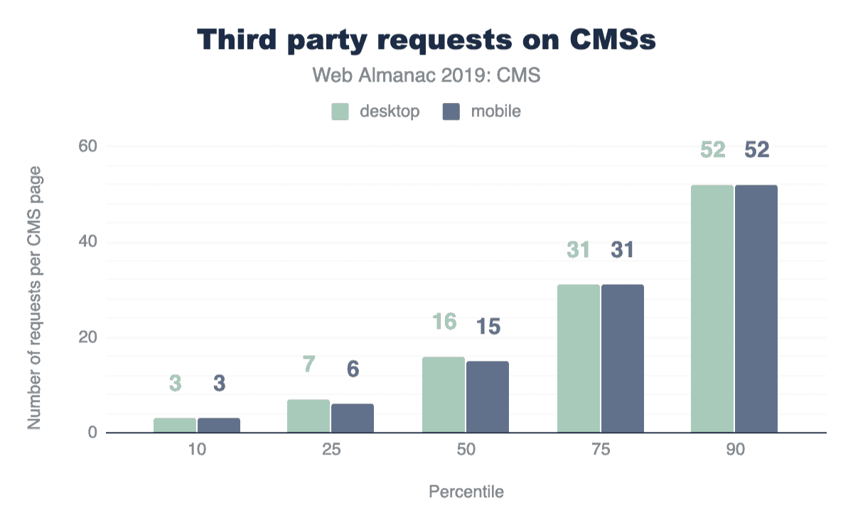 中央値は、少なくとも半分のCMSウェブページが、ここで報告している値よりも多くのサードパーティのリソースを提供していることを示しています。90パーセンタイルではCMSページは約940KBで52のリソースを配信できますが、これはかなりの増加です。