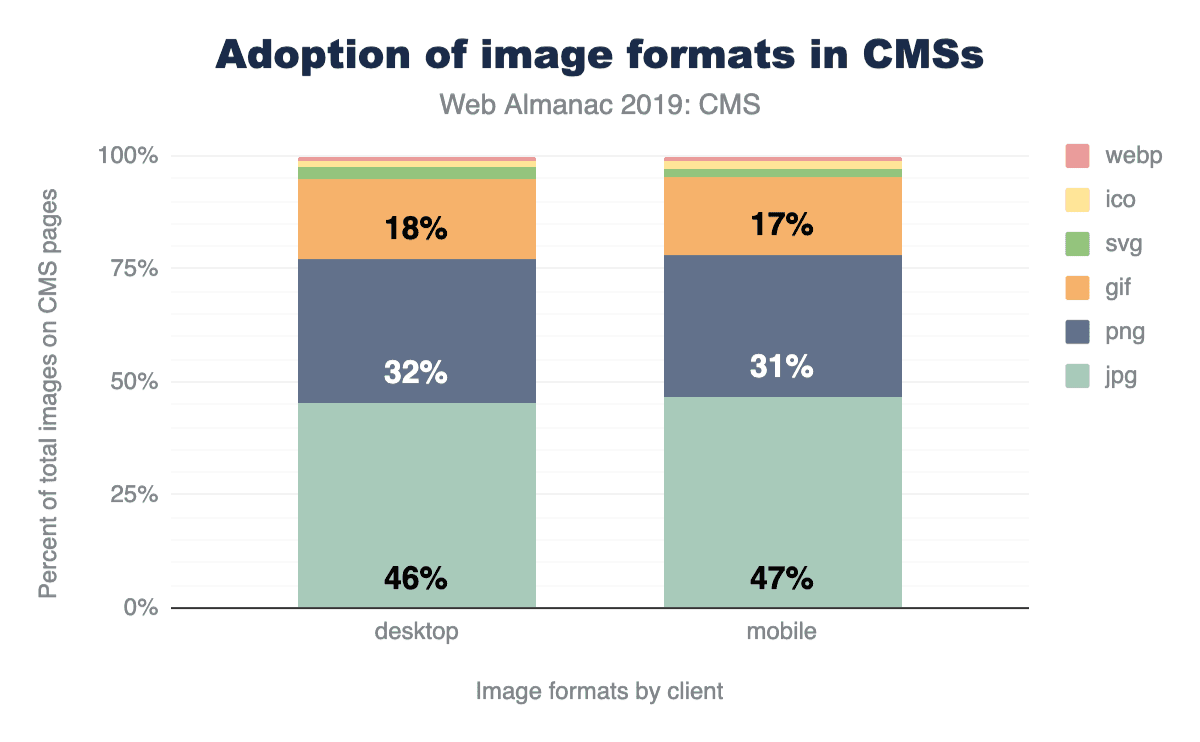 モバイルやデスクトップのCMSページでよく見られるフォーマットは何ですか? 当社のデータによると、平均的にJPG画像が最も人気のある画像フォーマットです。次いでPNG、GIFが続き、SVG、ICO、WebPのようなフォーマットが2%強、1%強と大きく後れを取っています。