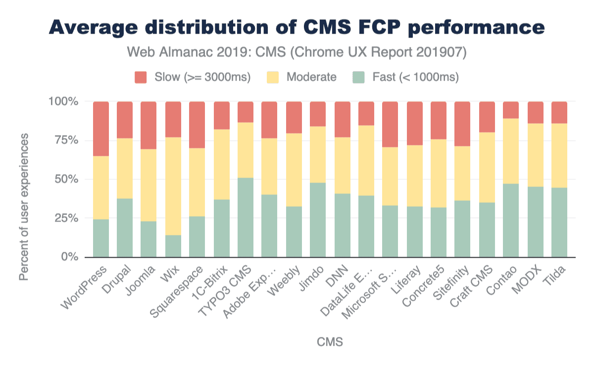 CMSの世界におけるFCPの傾向は、ほとんどが中程度の範囲にあります。CMSプラットフォームがデータベースからコンテンツを照会し、送信し、その後ブラウザでレンダリングする必要があるため、ユーザーが体験する遅延の一因となっている可能性があります。前のセクションで説明したリソース負荷も一役買っている可能性があります。さらに、これらのインスタンスの中には共有ホスティング上にあるものやパフォーマンスが最適化されていない環境もあり、これもブラウザ上での体験に影響を与える可能性があります。