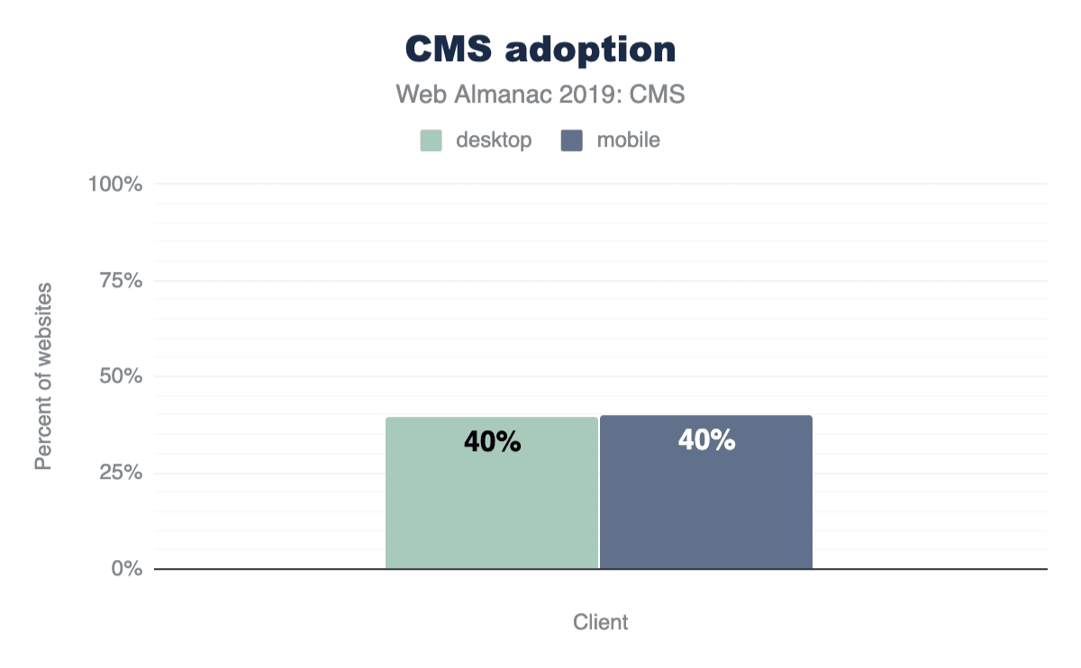 デスクトップとモバイルデバイスで提供されているウェブページを見てみると、何らかのCMSプラットフォームによって生成されたページとそうでないページの割合が約60-40%に分かれていることがわかります。