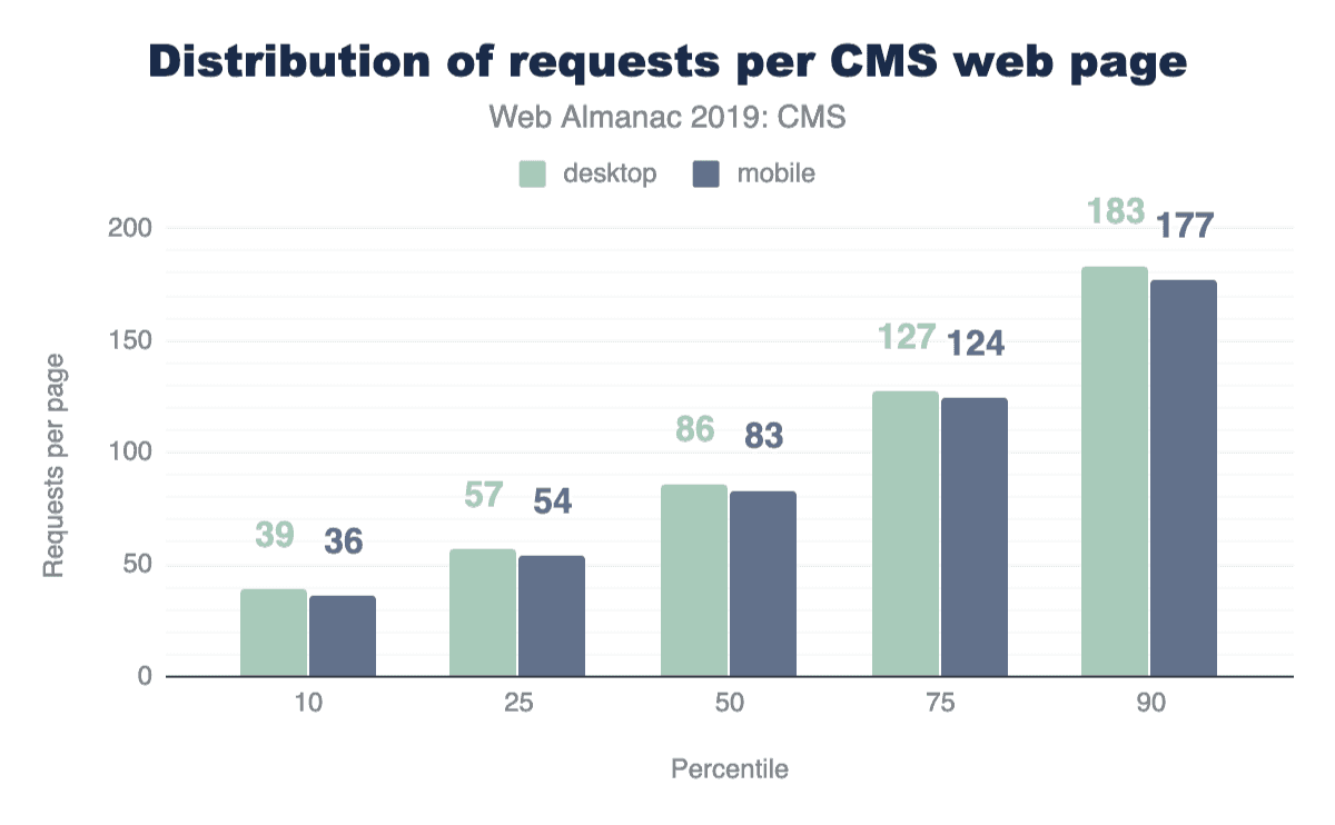中央値は、すべてのCMSページが上か下かの中間点を示しています。つまり全CMSページの半分はリクエスト数が少なく、重量が少ないのに対し、半分はリクエスト数が多く、重量が多いということになります。10パーセンタイルではモバイルとデスクトップのページはリクエスト数が40以下で重量が1MBですが、90パーセンタイルではリクエスト数が170以上で重量が7MBとなり、中央値の3倍近くになっています。