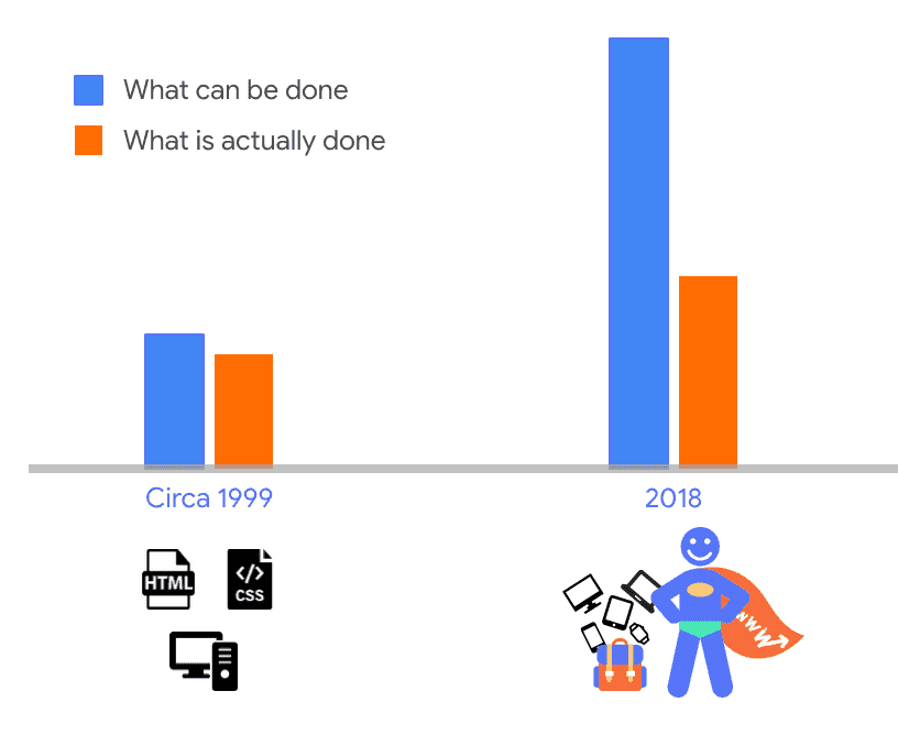 ウェブが進化するにつれ、ウェブはより強力になる一方で、より複雑になりました。その結果、その単純な成長のループは破られ、誰でもクリエイターになれるような状況ではなくなってしまいました。コンテンツ制作の道を追求できる人にとっては、その道のりは険しく困難なものになってしまいました。ウェブでできることと実際にできることの差である利用可能性ギャップは着実に拡大していきました。