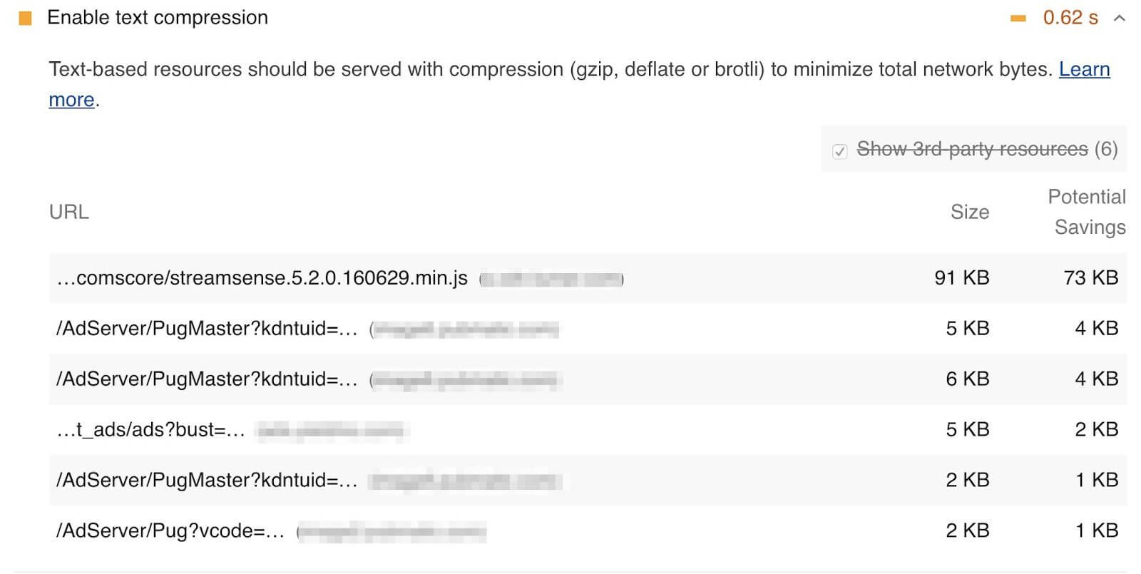 Lighthouseは、テキストベースの圧縮を有効にすることで、保存できるバイト数も示します。テキスト圧縮の恩恵を受ける可能性のあるサイトのうち、82%がページの重さを最大1MB削減できます!