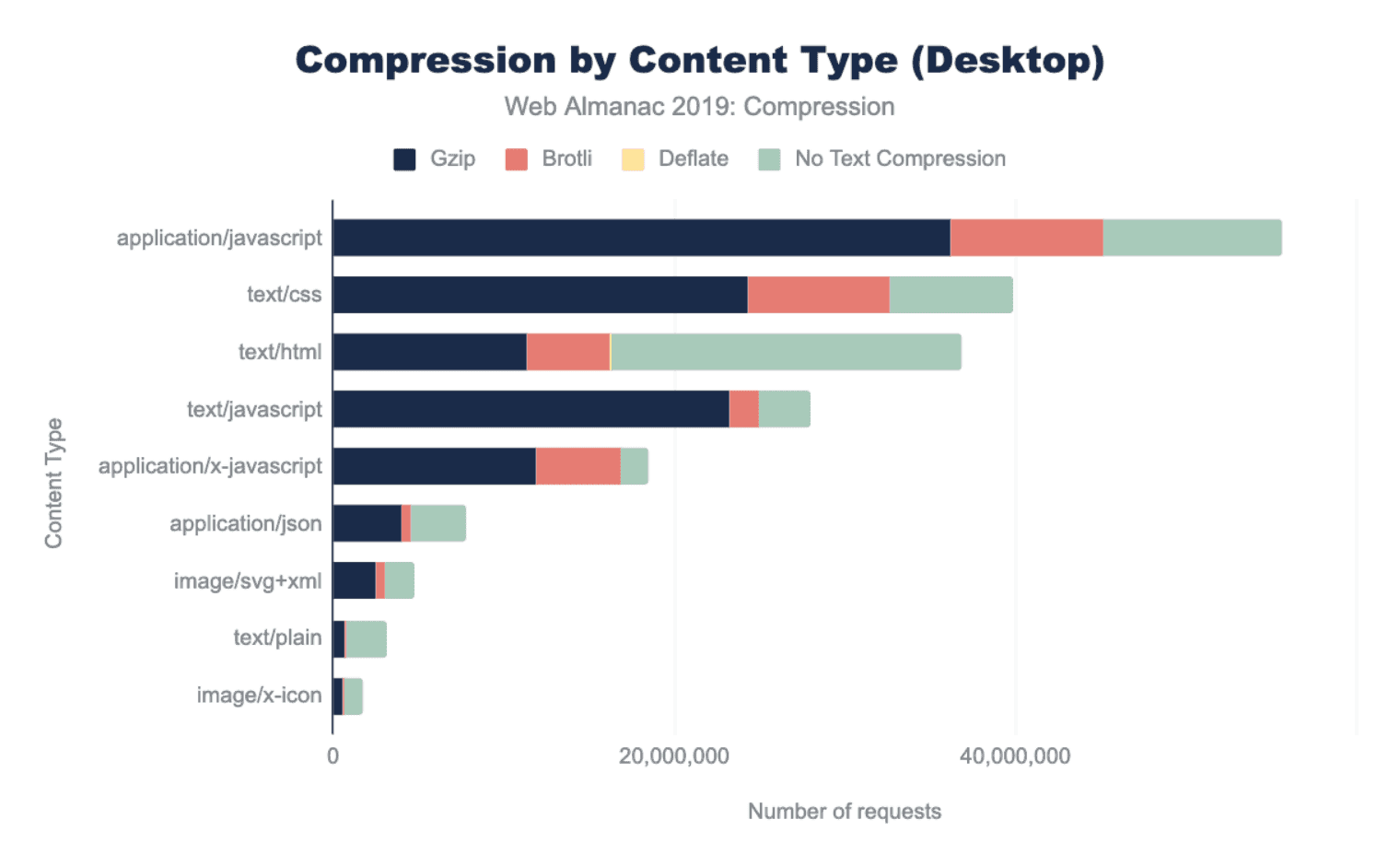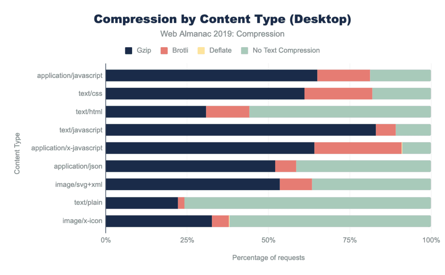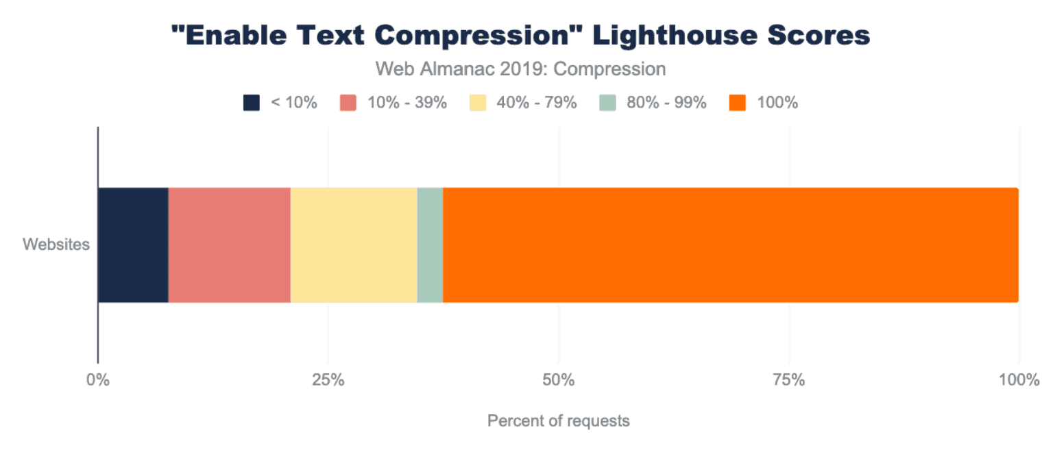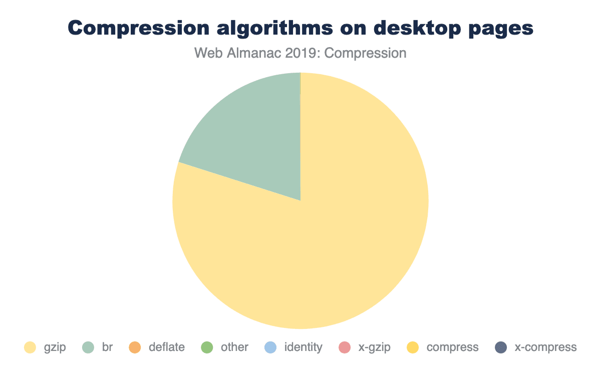 圧縮されて提供されるリソースの大半は、Gzip(80%)またはBrotli(20%)のいずれかを使用しています。他の圧縮アルゴリズムはあまり使用されません。