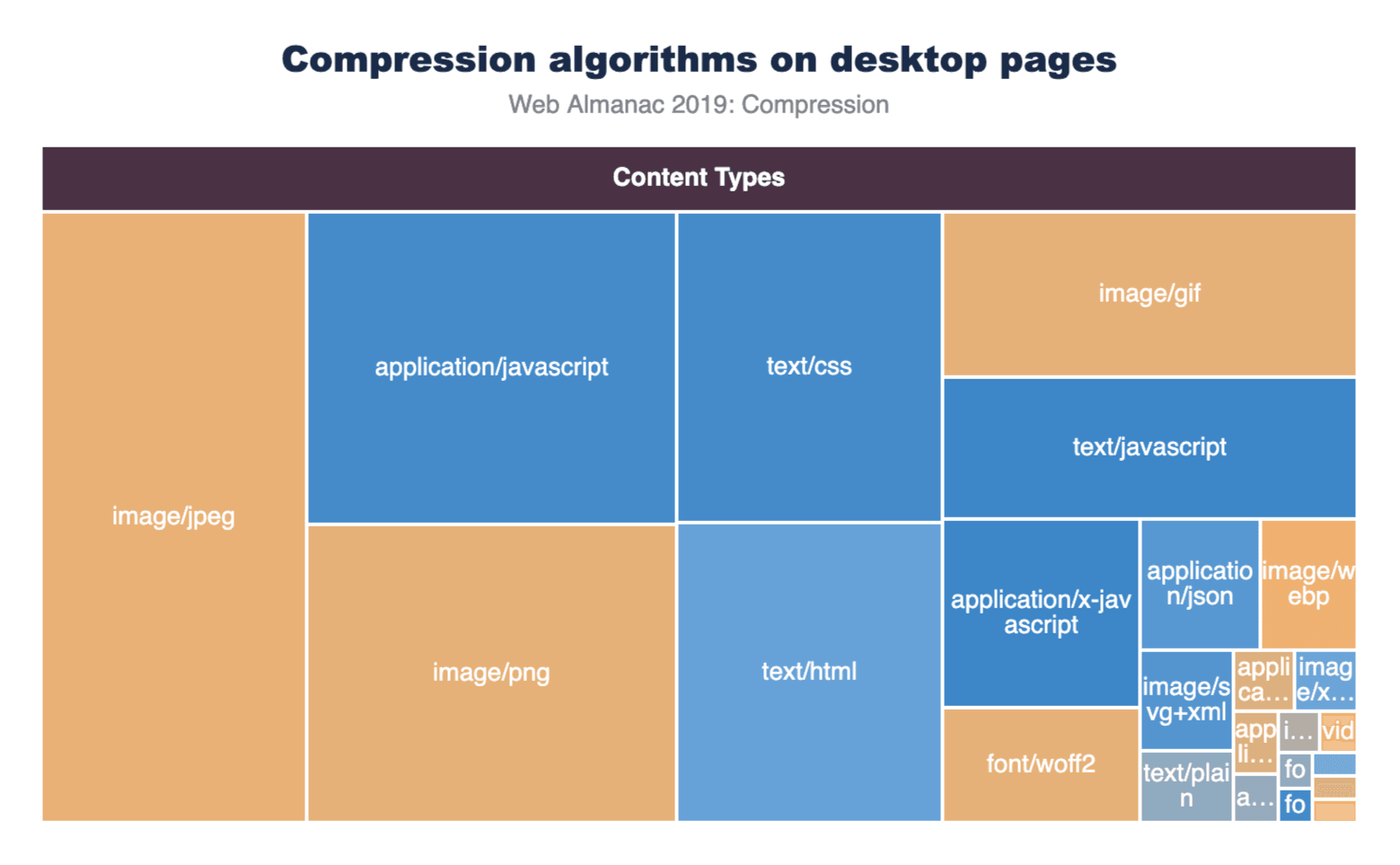 次のグラフでは、上位25のコンテンツタイプが、リクエストの相対数を表すボックスサイズで表示されています。各ボックスの色は、これらのリソースのうちどれだけ圧縮されて提供されたかを表します。ほとんどのメディアコンテンツはオレンジ色で網掛けされていますが、これはGzipとBrotliにはほとんどまたはまったく利点がないためです。テキストコンテンツのほとんどは、それらが圧縮されていることを示すために青色で網掛けされています。ただし、一部のコンテンツタイプの水色の網掛けは、他のコンテンツタイプほど一貫して圧縮されていないことを示しています。