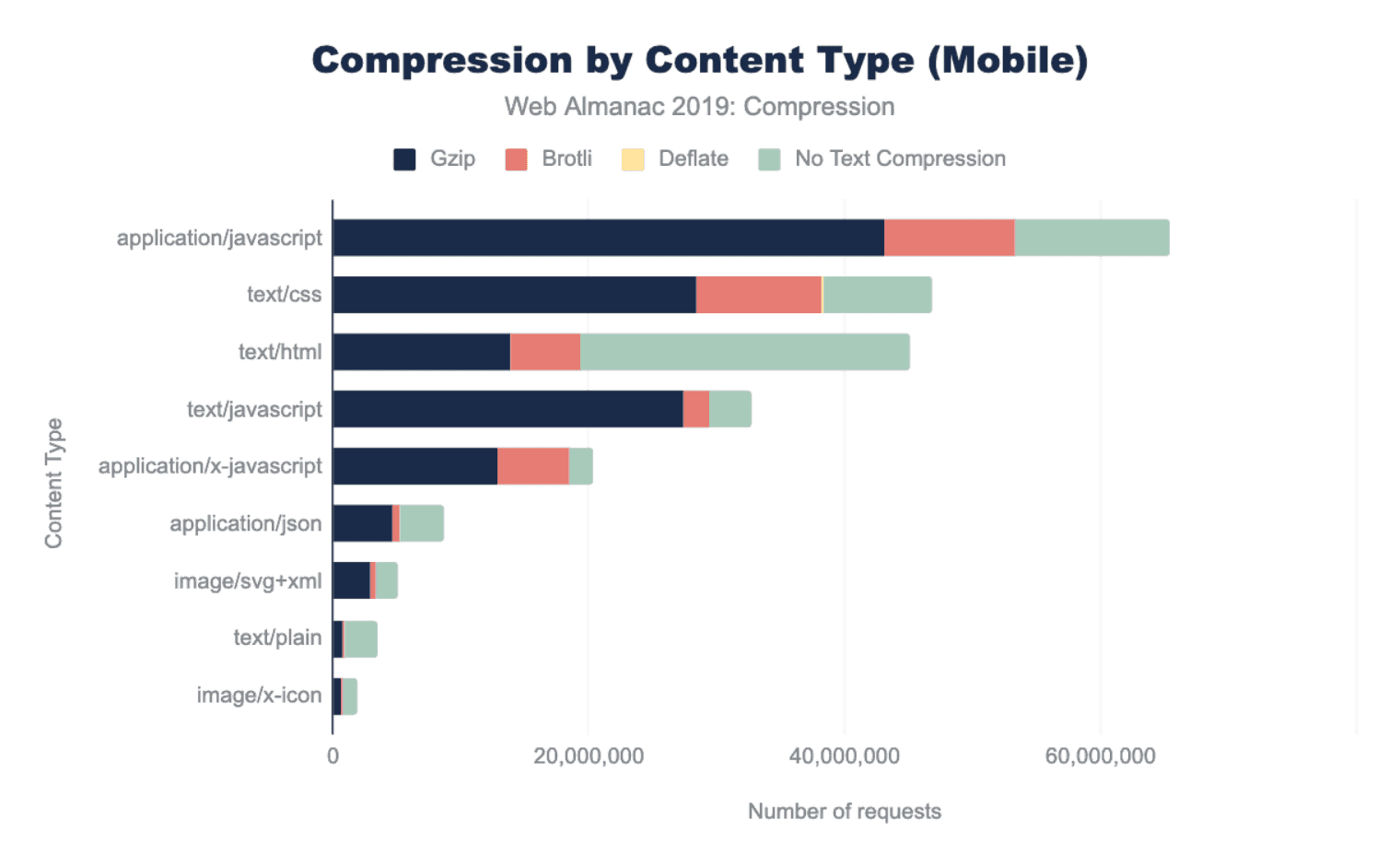 圧縮率が最も低いコンテンツタイプには、application/json、text/xml、およびtext/plainが含まれます。これらのリソースは通常、XHRリクエストに使用され、Webアプリケーションが豊かな体験を創造するために使用できるデータを提供します。それらを圧縮すると、ユーザー体験は向上する可能性があります。 image/svg+xmlやimage/x-iconなどのベクターグラフィックスは、テキストベースと見なされることはあまりありませんが、これらを使用するサイトは圧縮の恩恵を受けるでしょう。