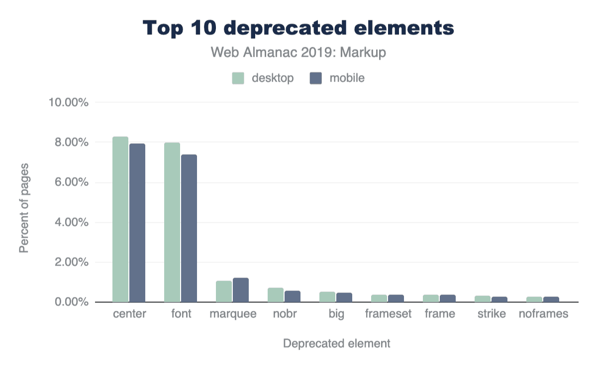 付け加えると、デスクトップページの15%とモバイルページの16%には、既に廃止された要素が含まれています。