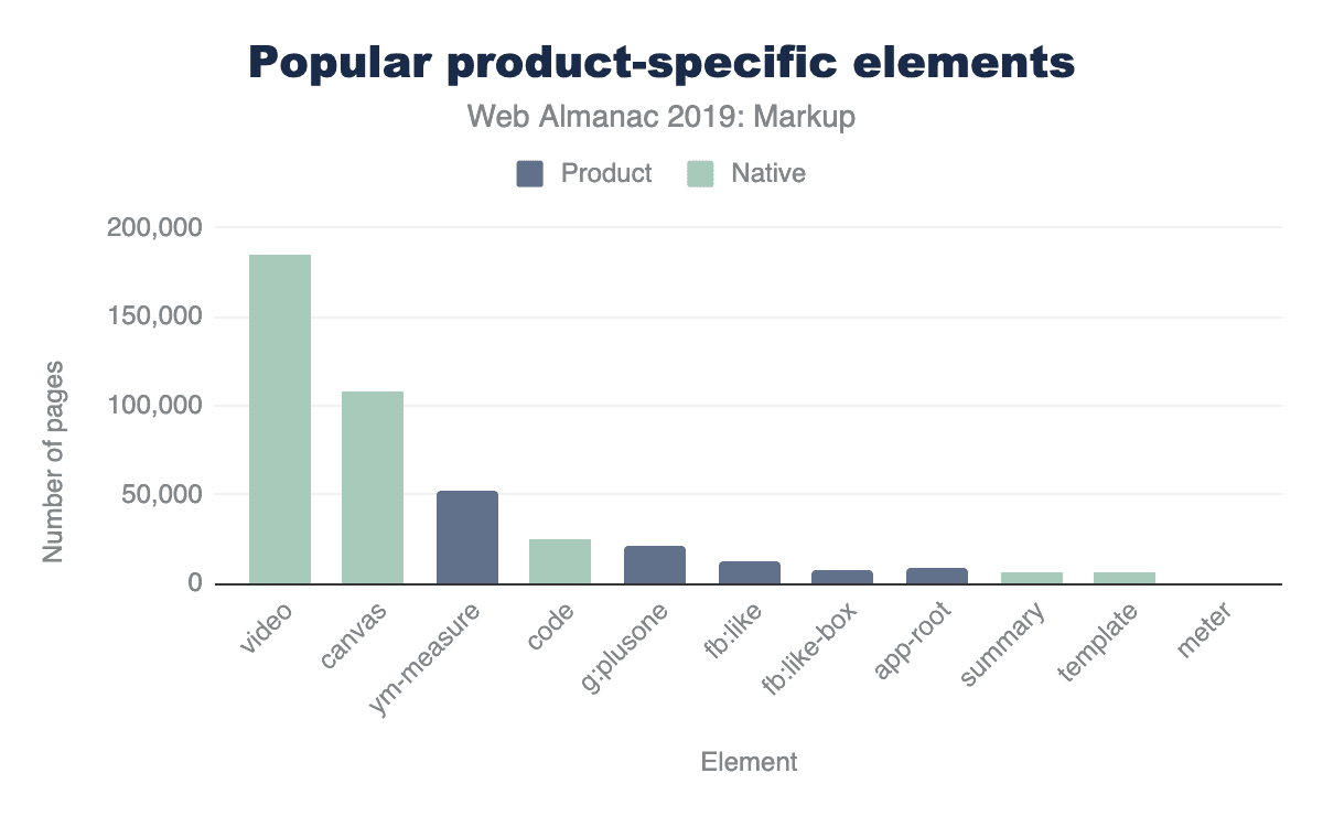 ほとんどの要素は、ネイティブの物も含めてページの1%未満として現れていますが、それでも非常に重要であり成功しています。たとえば<code>は私が頻繁に使用する要素です。 これは間違いなく便利で重要ですが、ページの0.57%でしか使われていません。この部分は私達の測定対象に基づいているため偏っています。通常、ホームページは特定の種類のもの(たとえば<code> など)が含まれる可能性は低いでしょう。例えば、ホームページでは見出し、段落、リンク、リスト以外はあまり一般的ではないでしょう。ただし、データには一般的に価値があります。
