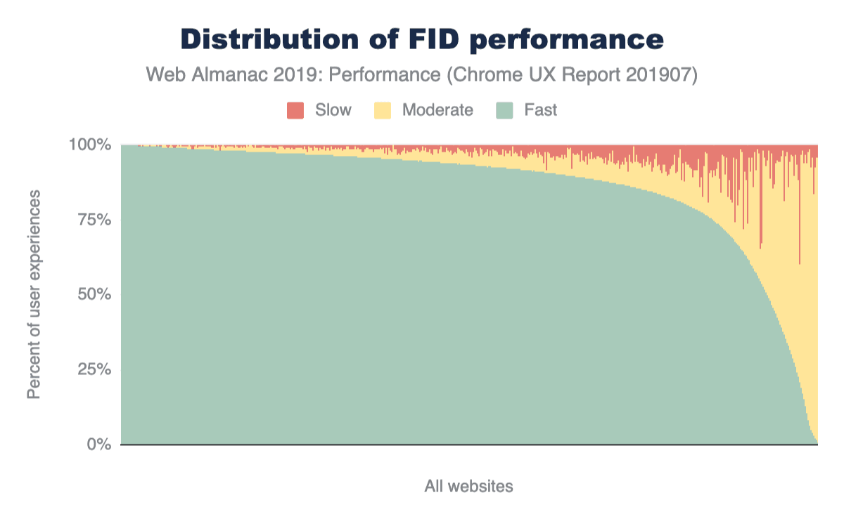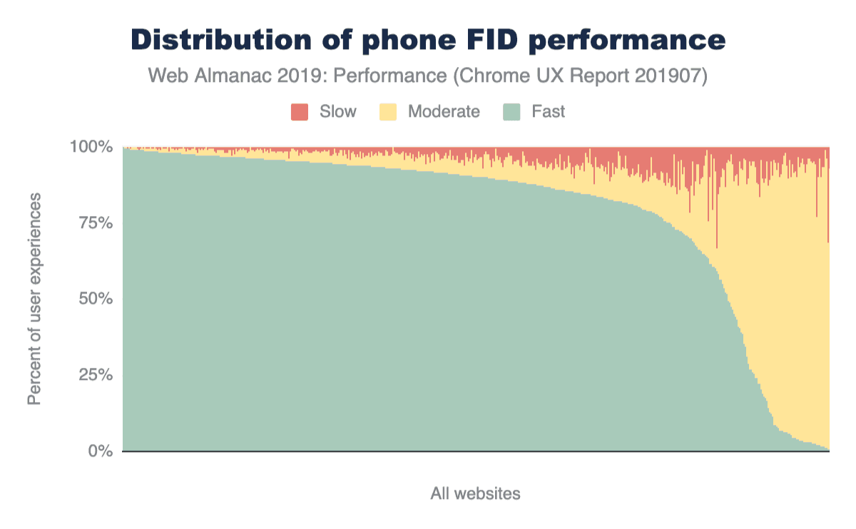 貴方はいま難題を抱えています。この表はWebサイトの高速、適度、低速のFID体験の分布を表しています。これは以前のFCPとTTFBの表とは劇的に異なります。(図7.1と図7.9をそれぞれ見る).高速FIDの曲線は100%から75%にゆるやかに下っていき、その後急降下します。FIDの体験は、ほとんどのWebサイトでほぼ高速になっています。