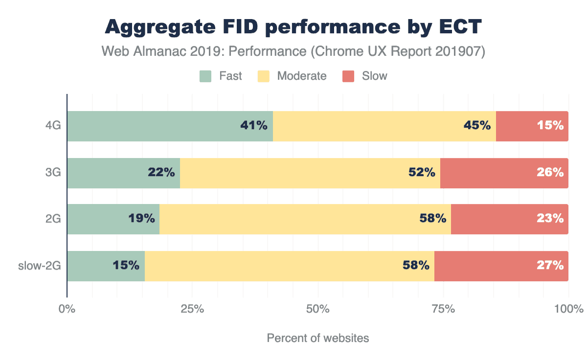 上記のECTの結果からは、接続速度とFIDパフォーマンスの間に相関関係があることが示されています。ユーザーの有効な接続の速度が低下すると、高速なFIDを体験するWebサイトの割合も低下しています。4GのECTを使うユーザーがアクセスするWebサイトの41%は高速なFIDで、3Gは22%、2Gは19%、低速な2Gは15%です。