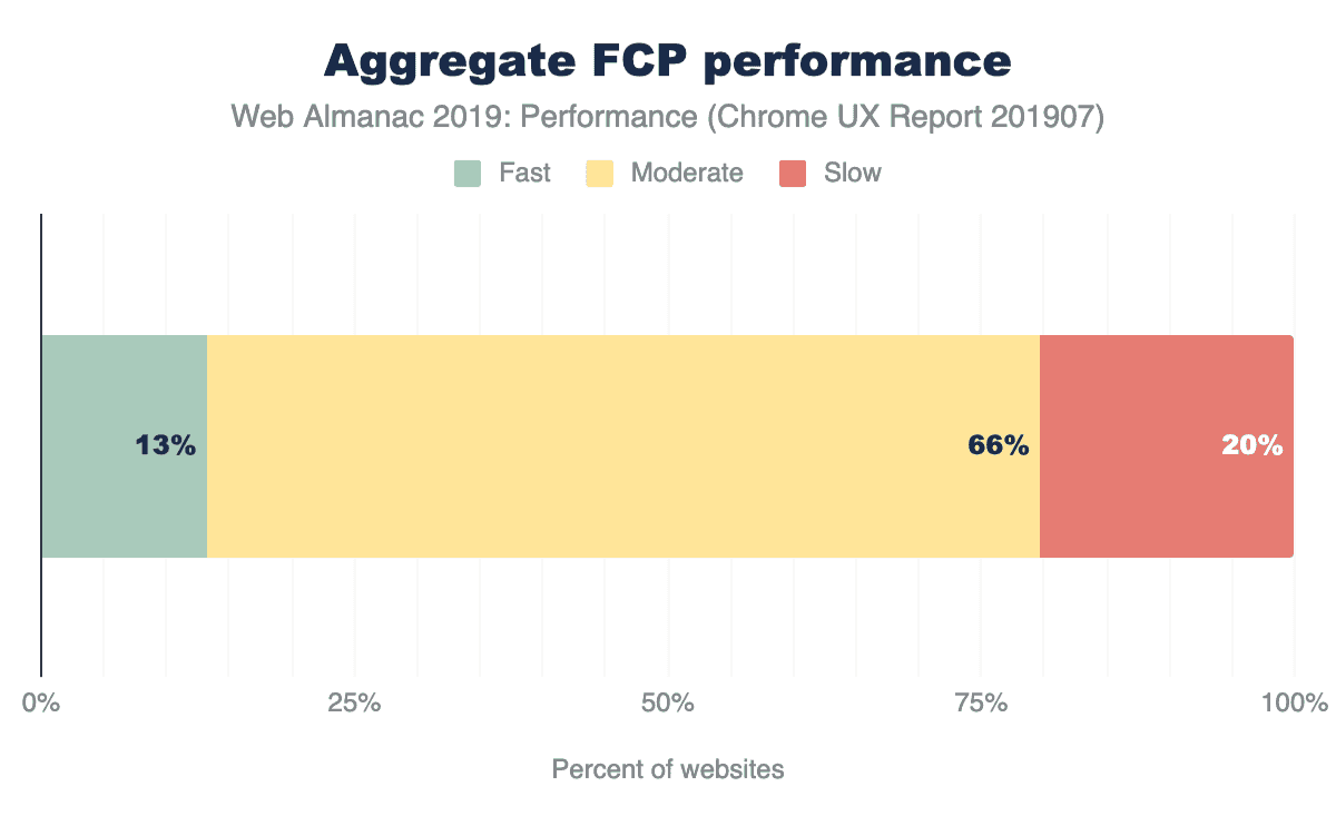 図7.2の結果は、Webサイトの13%だけが高速と判断されています。これはまだ改善の余地があるようですが、多くのWebサイトで意味を持つコンテンツを素早く一貫して描画できています。Webサイトの3分の2は適度のFCP体験となっているようです。