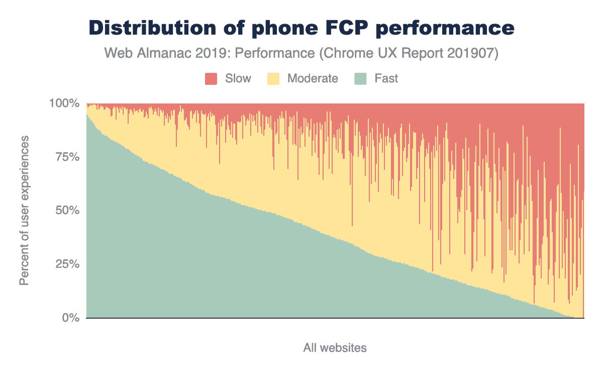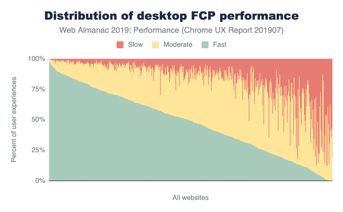 図7.1では、FCPの体験がWeb全体でどのように分散しているかを見ることができます。このチャートは、CrUXデータセット内にある数百万のWebサイト分布を1,000個のWebサイトに圧縮しており、図の縦線一つ一つはWebサイトを表しています。このグラフは、1秒未満の高速なFCP体験、3秒以上かかる遅い体験、その中間にある適度な体験(以前は平均と言われていた)の割合で並べられています。グラフには、ほぼ100%高速な体験を備えたWebサイトと、ほぼ100%低速な体験となっているWebサイトが存在しています。その中間にある、高速、適度、及び低速のパフォーマンスが混じり合ったWebサイトは、低速よりも適度か高速に傾いており、良い結果になっています。