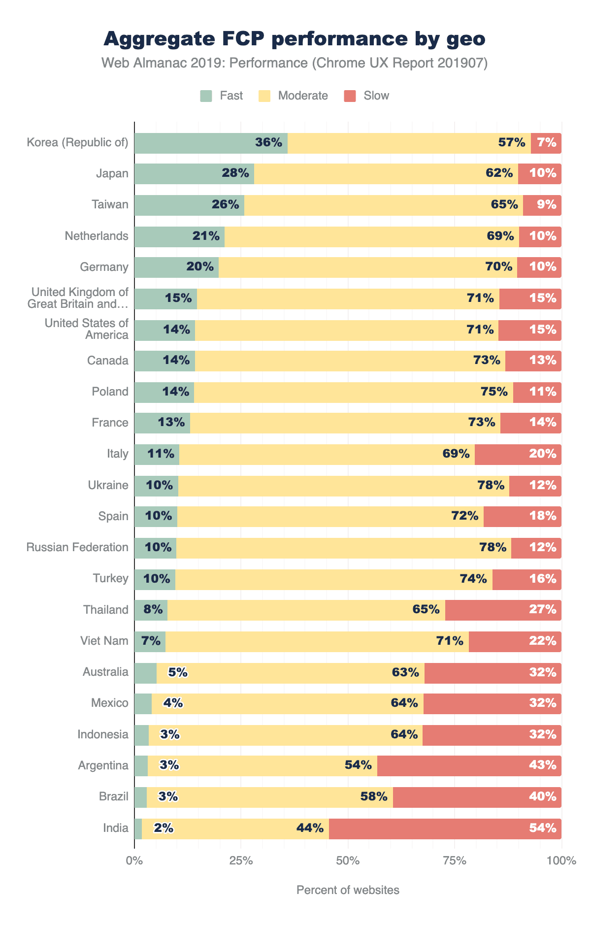最後にユーザーの地理(geo)でFCPを切り分けてみましょう。上記のグラフは、個別に多くのWebサイトを持っているトップ23の地域を表しています。これはオープンWeb全体での人気の計測です。アメリカのWebユーザーは、1,211,002の最も際立ったWebサイトにアクセスします。十分に高速なFCP体験のWebサイトの割合で地理をソートしましょう。リストのトップ3にはアジアパシフィック(APAC)が入っています。それは韓国、台湾、日本です。この結果から、これらの地域では非常に高速なネットワーク接続が使われていることが説明できます。韓国では高速のFCP基準を満たすウェブサイトが36%あり、低速と評価されているのはわずか7%です。高速/適度/低速のウェブサイトの世界的な分布はおおよそ13/66/20であり、韓国がかなり良い意味で外れ値となっています。