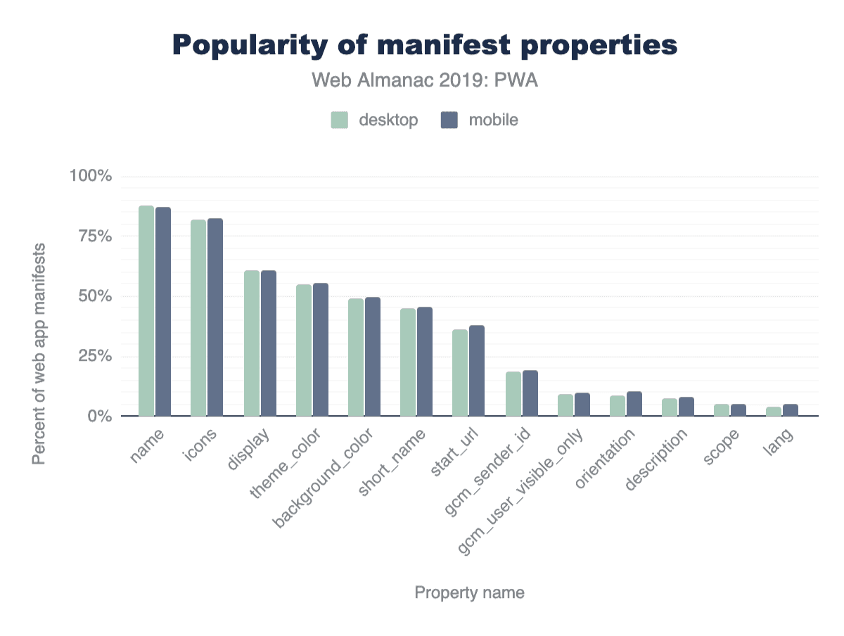 頻繁に遭遇した独自のプロパティは、従来のGoogle Cloud Messaging(GCM)サービスのgcm_sender_idとgcm_user_visible_onlyでした。興味深いことに、モバイルとデスクトップにはほとんど違いがありません。ただし、両方のプラットフォームで、ブラウザーによって解釈されないプロパティの長いテールがありますが、作成者やバージョンなどの潜在的に有用なメタデータが含まれています。また、重要なタイプミスのプロパティもありました。私たちのお気に入りは、short_nameではなくshot_nameです。興味深い外れ値はserviceworkerプロパティです。これは標準ですが、ブラウザベンダーによって実装されていません。それでも、モバイルおよびデスクトップページで使用されるすべてのWebアプリマニフェストの0.09%で見つかりました。