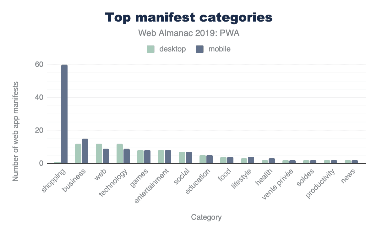 このプロパティを利用したマニフェストはあまり多くありませんでしたが、モバイルで最も人気のあるカテゴリである「ショッピング」から「ビジネス」「テクノロジー」、そして最初の場所を均等に共有するデスクトップ上の「ウェブ」(それが意味するものは何でも)。