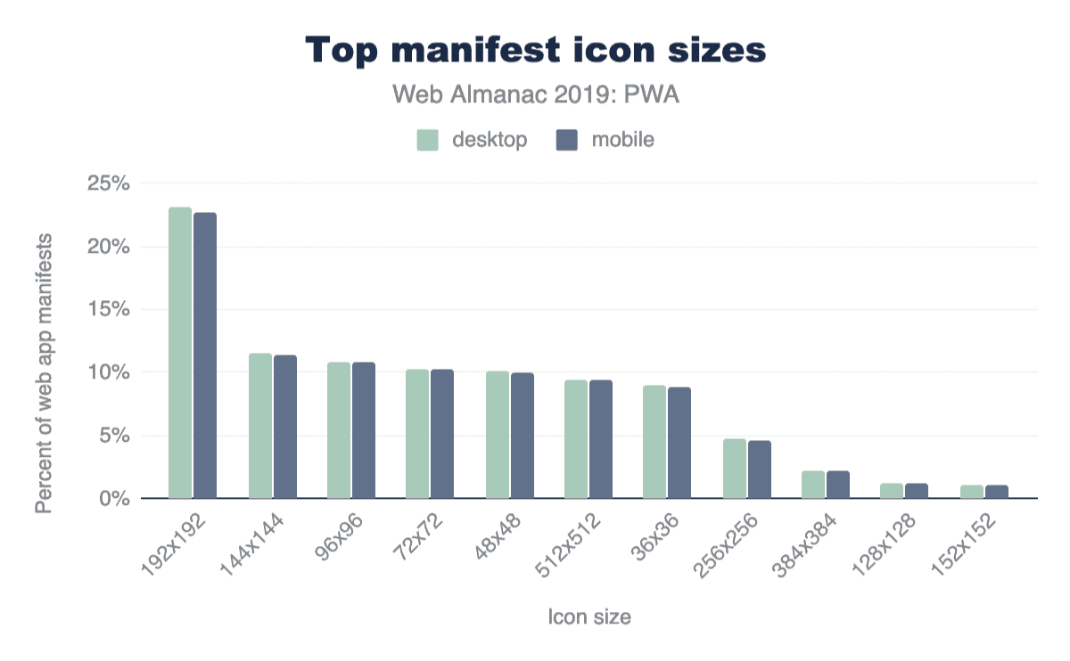 Lighthouseのルールが、おそらくアイコンサイズ選択の犯人で、192ピクセルがデスクトップとモバイルの両方で最も人気があります。Googleのドキュメントで512X512を明示的に推奨していますが、これは特に目立つオプションとしては表示されてません。