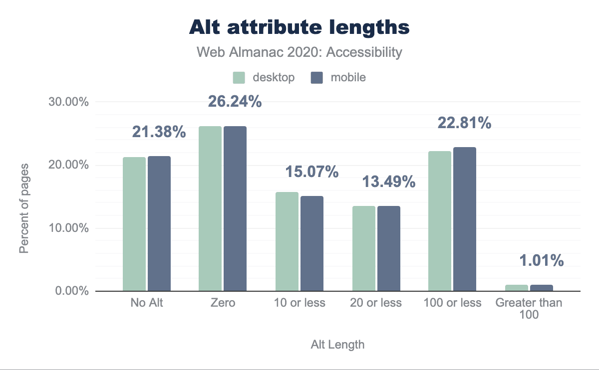 alt属性の長さをページの割合でグループ化した棒グラフ。デスクトップ画像の21.25%、モバイル画像の21.38%がalt属性を持たないが、デスクトップ画像の26.20%、モバイル画像の26.24%が長さゼロ、デスクトップ画像の15.76%、モバイル画像の15.07%が長さ10以下、デスクトップ画像の13.56%、モバイル画像の13.49%が長さ20以下、デスクトップ画像の22.23%、モバイル画像の22.81%が長さ100以下、デスクトップ画像の1.00%、モバイル画像の1.01%が長さ100を超えています。alt属性は25年前から存在していますが、デスクトップ画像の21.24%とモバイル画像の21.38%が代替テキストを欠いていることもわかりました。これは選択したアクセシビリティツールを使用してテストする最も簡単な自動チェックの1つであり、ぶら下がりが少なく、比較的簡単に解決できる問題であるはずです。