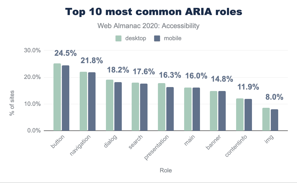 デスクトップサイトの25.20%、モバイルサイトの24.50%が、明示的 role="button"が割り当てられた要素を少なくとも1つ持つホームページを持っていることがわかりました。これは約4分の1のウェブサイトが要素のセマンティクスを変更するためにbuttonロールを使用していることを示唆していますが、ボタンロールを明示的に割り当てられているボタンを除いては、冗長ではありますが無害です。