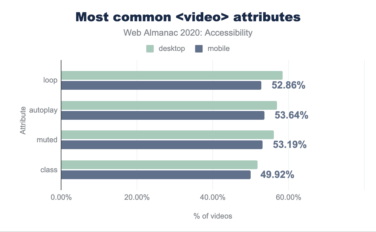 動画があるページのうち、デスクトップページの56.98%とモバイルページの53.64%が autoplay属性を持っており、デフォルトで動画再生されることがわかりました。また、デスクトップページの58.42%、モバイルページの52.86%がloop属性を持っており、これは動画が無期限に再生されることを意味している可能性の高いことがわかりました。これらの動画を一時停止、停止、または非表示にするメカニズムも考えられますが、自動再生やループ再生を停止する必要はなく動画を再生することを選択することがデフォルトであるべきです。これらのメトリクスは、動画を持つウェブサイトの半分以上が重要なアクセシビリティの障壁を持っている可能性があることを示唆しています。