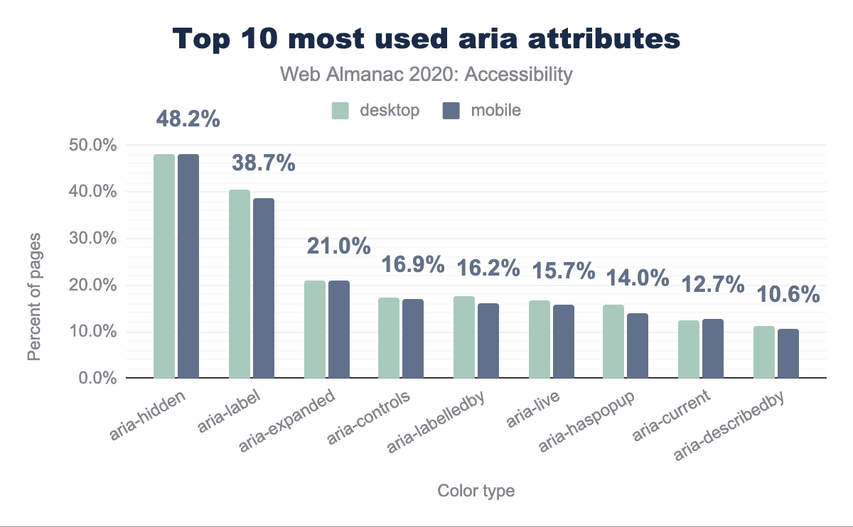 要素のaria-labelは、開発者が文字列の値を提供することを可能にし、これがその要素のアクセシブルな名前に使用されます。デスクトップページの40.44%、モバイルホームページの38.72%がaria-label属性を持つ要素を少なくとも1つ持っていることがわかり、これがアクセシブルな名前を提供するための最も一般的なARIA属性となりました。