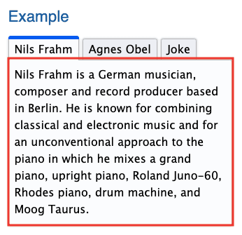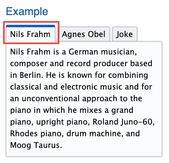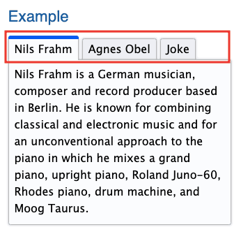 このパターンでは、親コンテナはrole="tablist"を持ち、子要素はrole="tab"を持ちます。これらのタブはrole="tabpanel"を持つ要素に関連付けられており、そのタブの内容が含まれています。