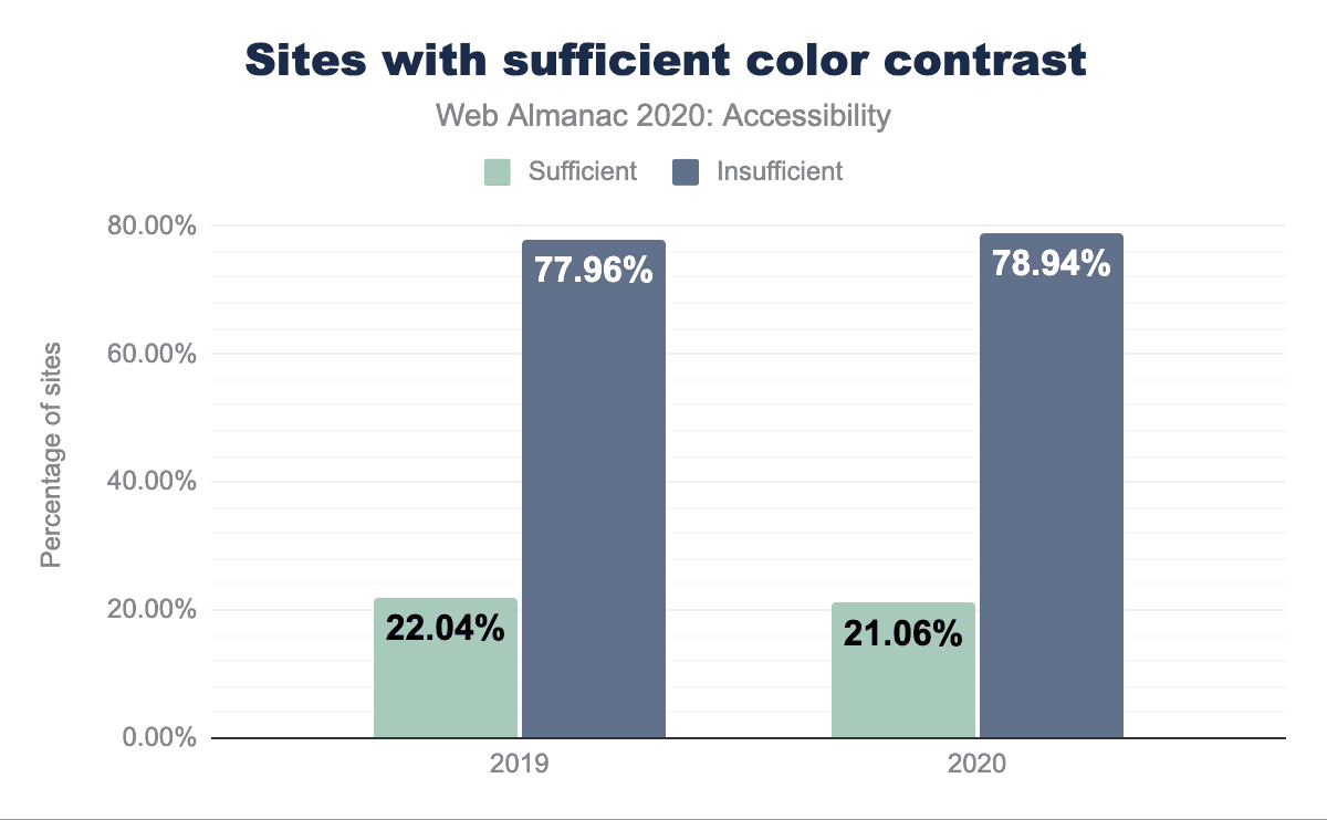 残念ながら、十分なカラーコントラストを持つサイトは21.06%しかありませんでした。これは昨年のすでにひどい22%からの減少です。