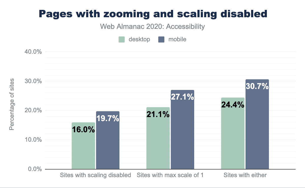 デスクトップページの29.34%とモバイルページの30.66%が、maximum-scaleを1未満の値に設定するか、user-scalableを0またはnoneに設定することで、スケーリングを無効にしようとしていることがわかった。いくつかのOSでは、HTMLで設定されているズームや拡大縮小の無効化に対応していないものがあります。これに対応しているシステムでは、一部のシステムではページが事実上使えなくなることがあります。ブラウザのズームを無効にするのを避ける理由については、Adrian Roselliの記事Don’t Disable Zoom を参照してください。