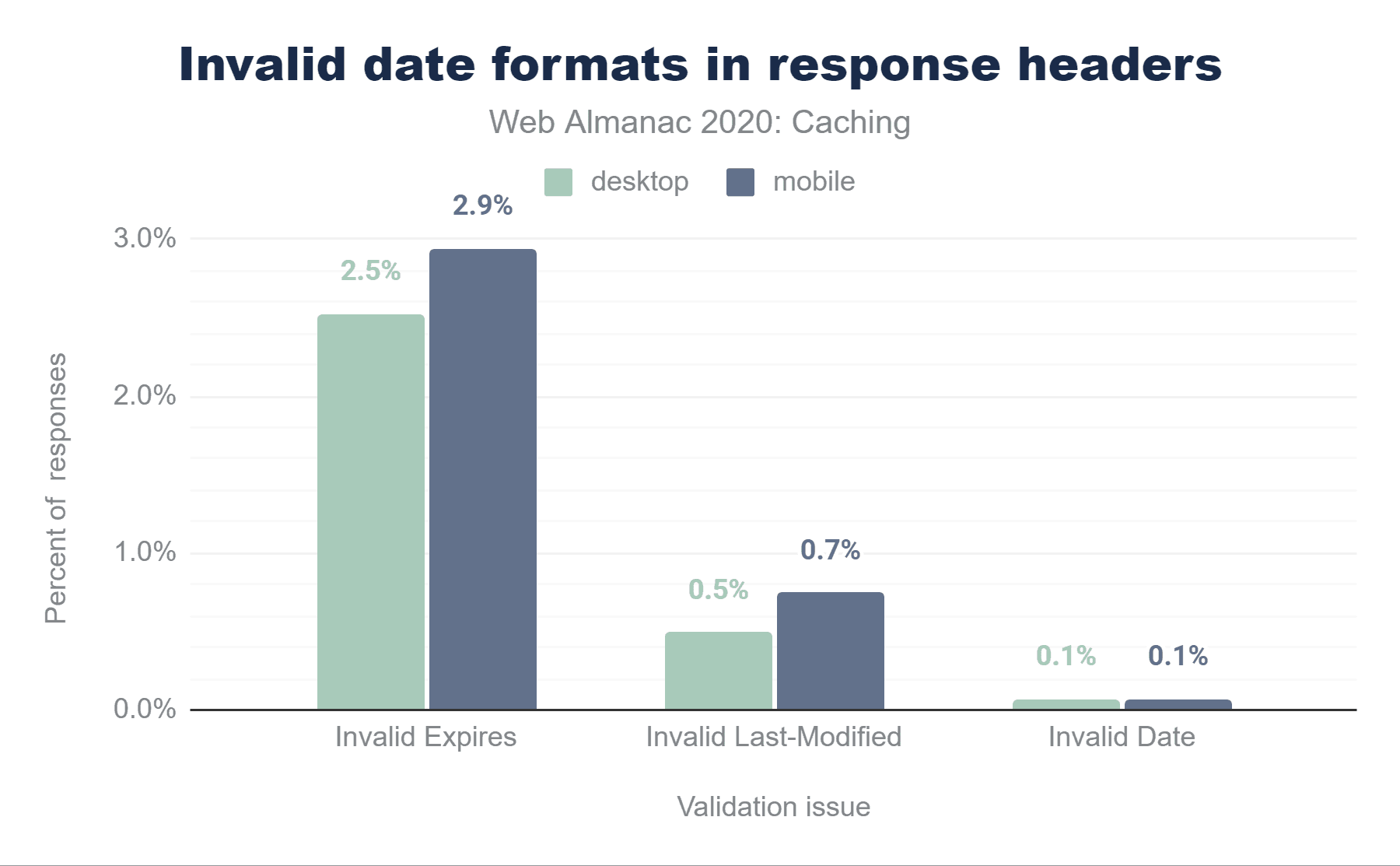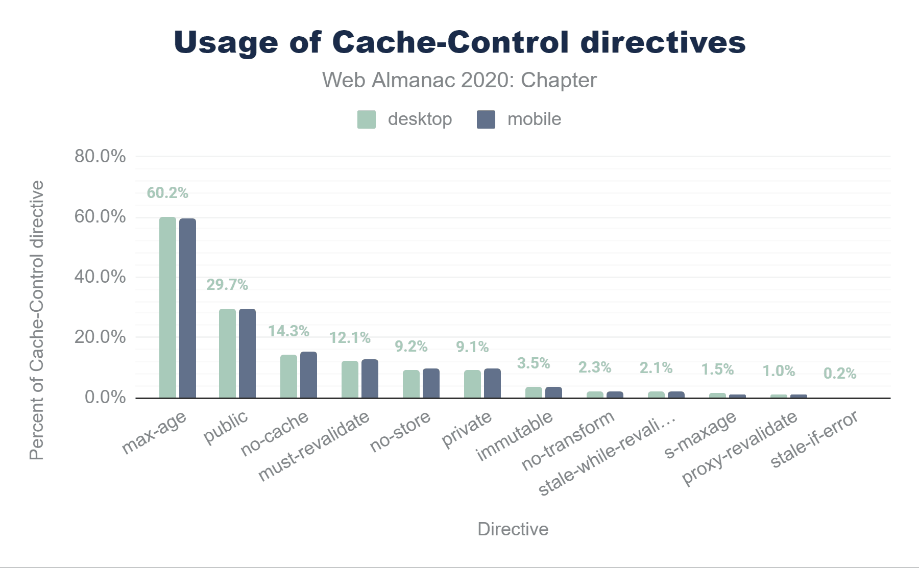 また、デスクトップでは、Cache-Controlヘッダーの使用がわずかに増加(1.8%)していますが、古いExpiresヘッダーの使用はわずかに減少(0.2%)しています。デスクトップでは、Cache-Controlがわずかに増加し(1.3%)、Expiresの増加は少ない(0.8%)ことがわかります。つまり、デスクトップのサイトでは、ExpiresではなくCache-Controlヘッダーを追加するケースが増えているようです。