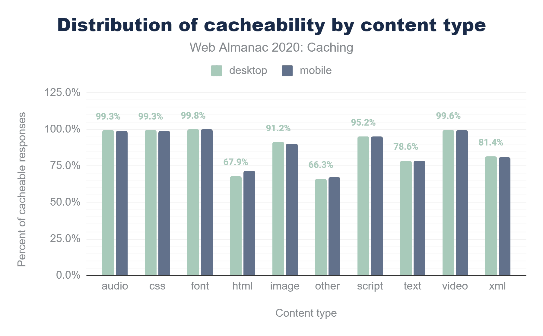コンテンツタイプ別のキャッシュ可能性を下の図で詳しく見てみると、フォント、ビデオやオーディオ、CSSファイルは100%近くブラウザキャッシュされている一方で(これらのファイルは一般的に静的であるため、これは理にかなっている)、全HTMLレスポンスの約3分の1はキャッシュ不可能であると考えられます。
