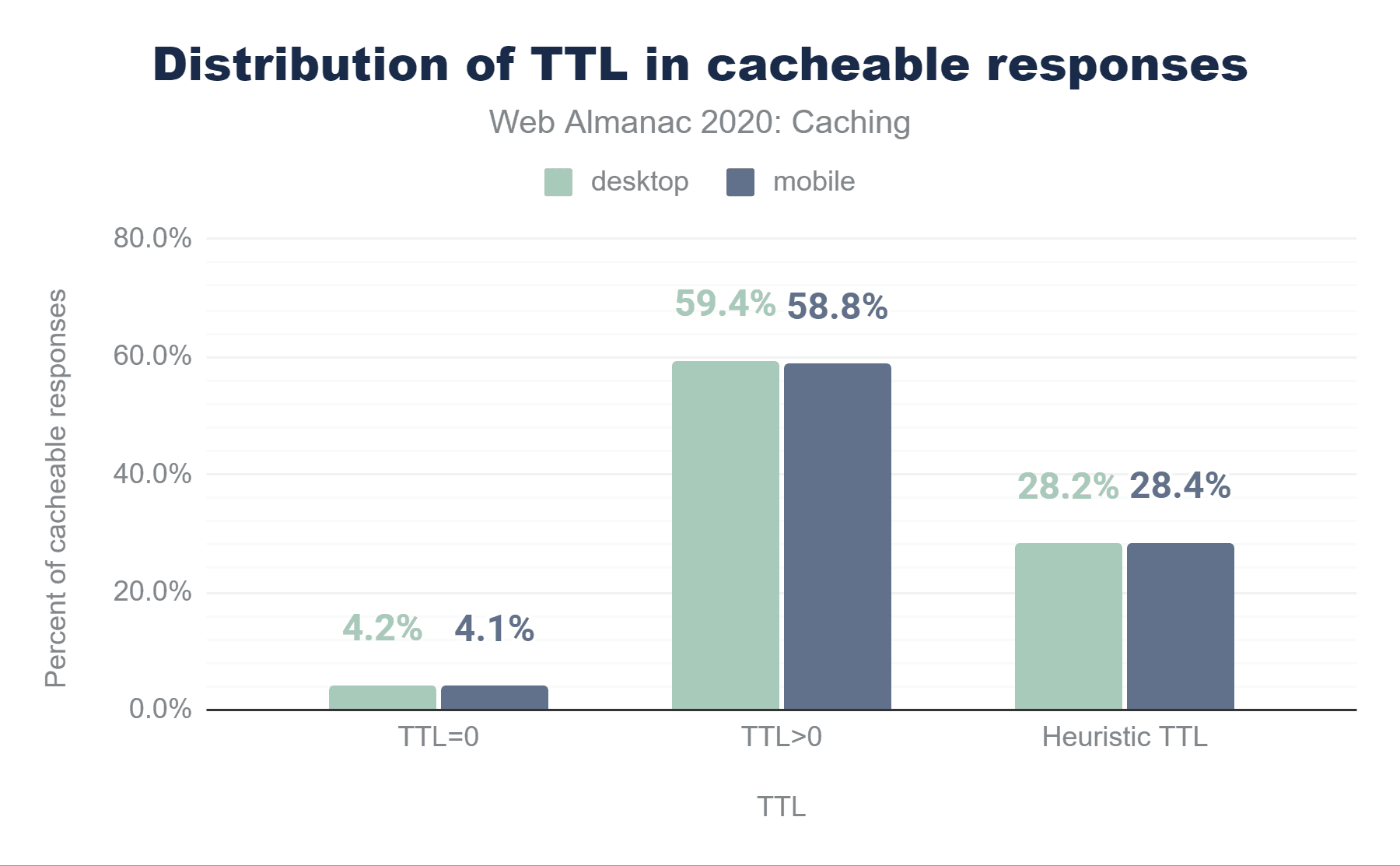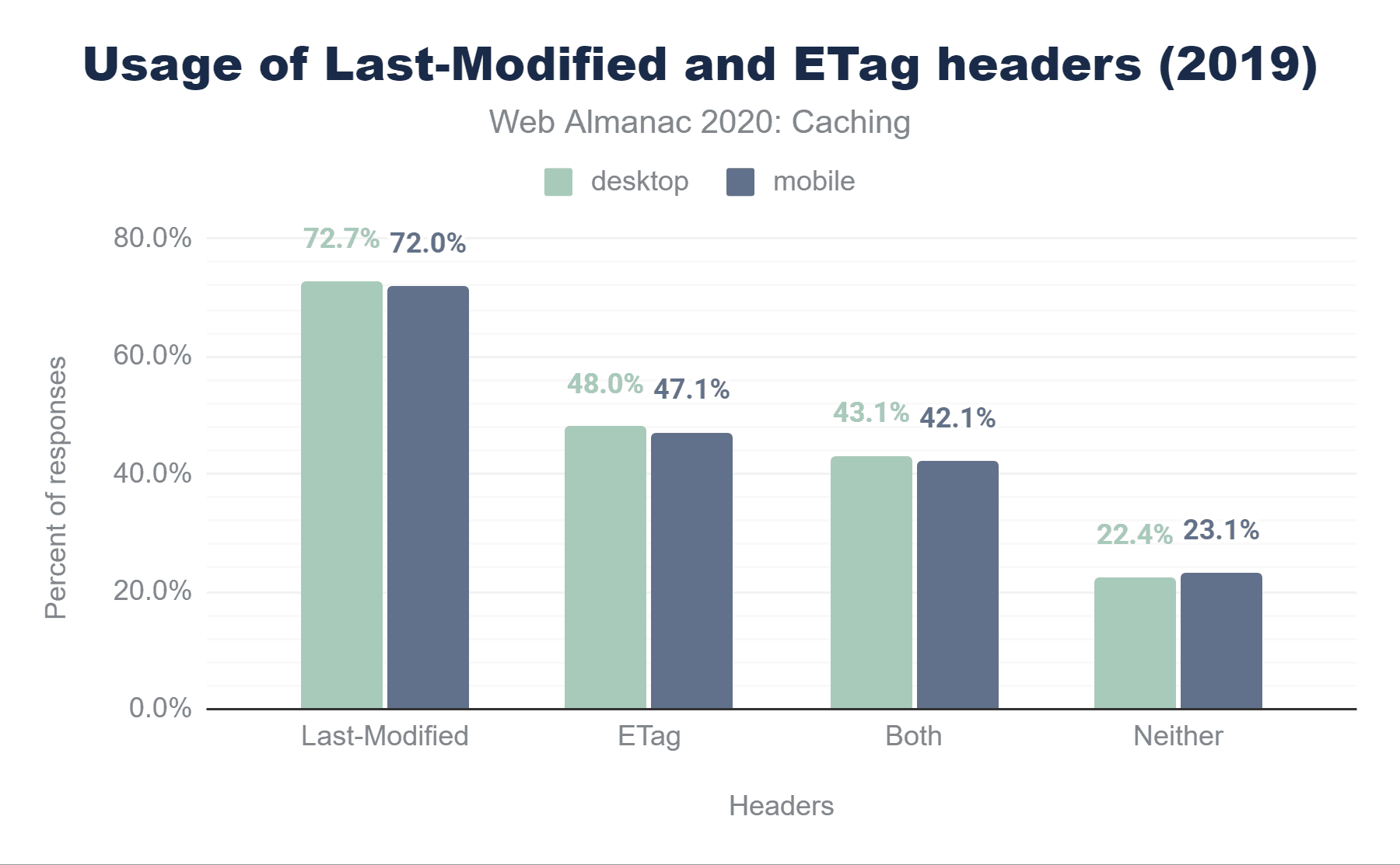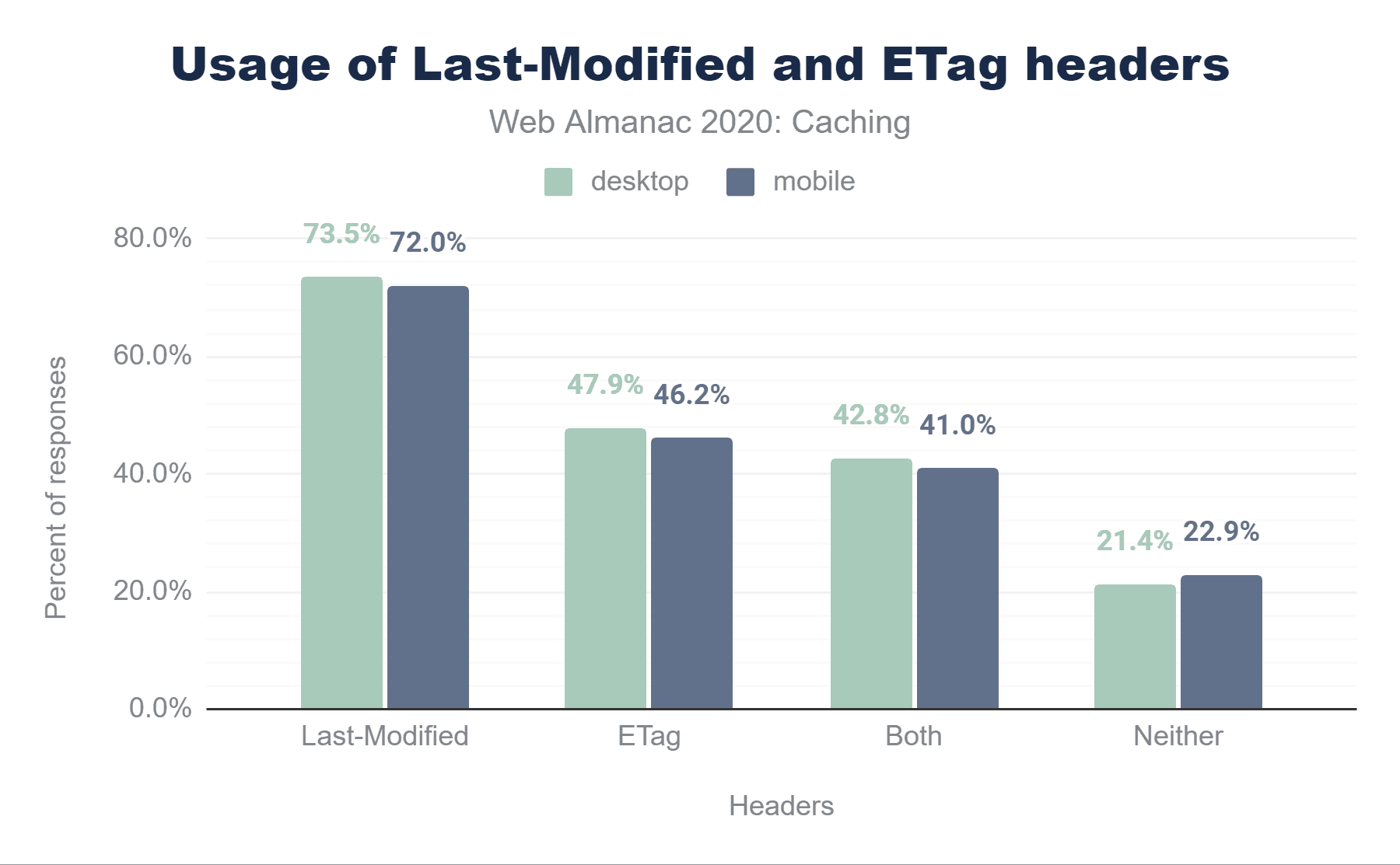 モバイルのレスポンスのうち73.5%はCache-Controlヘッダーが付いており、56.2%はExpiresヘッダーが付いていますが、レスポンスに両方のヘッダーが含まれているため、これらのほぼすべて(55.4%)は使用されません。25.6%のレスポンスはどちらのヘッダーも含まれていないため、ヒューリスティックキャッシングの対象となります。