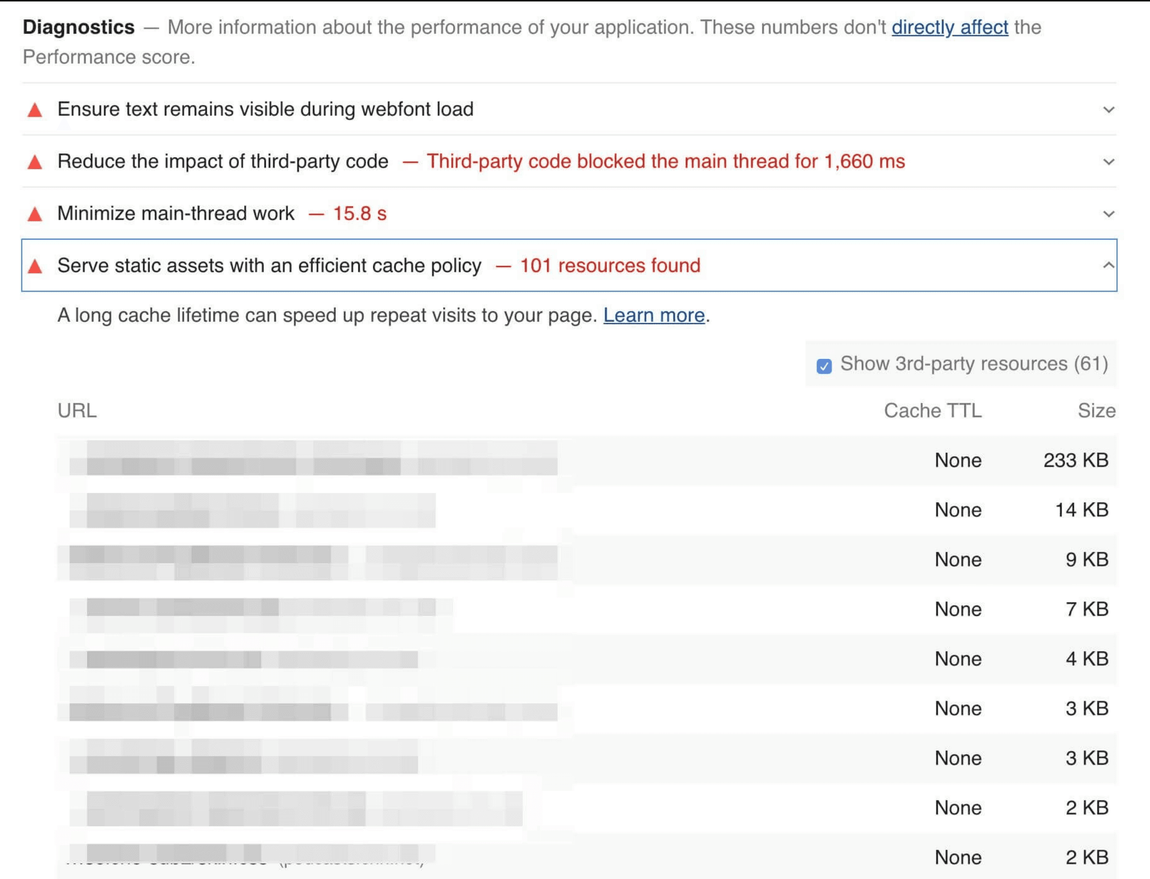 上の表でファーストパーティとサードパーティに分けてみると、ファーストパーティのリソースの約3分の2(61.8%)がTTLを長くすることでメリットを得られることがわかります。このことから、キャッシュ可能なものにとくに注意を払い、キャッシュを正しく設定していることを確認する必要があります。