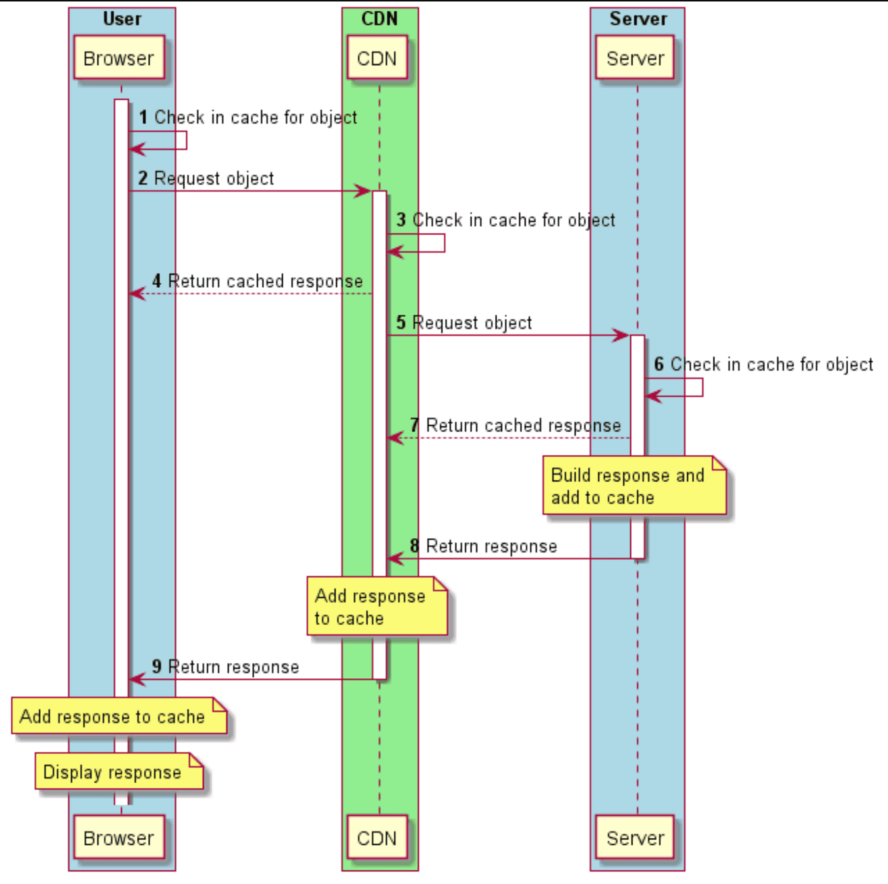 下図は、オブジェクト(Webページなど)に対する典型的なリクエスト/レスポンスの流れを示しています。ブラウザとサーバの間にはCDNがあります。ブラウザ→CDN→サーバの流れの各ポイントで、各キャッシングエンティティは、まず自分のキャッシュにオブジェクトがあるかどうかを確認します。見つかった場合は、キャッシュされたオブジェクトをリクエスト元に返し、その後、リクエストを次のキャッシュエンティティに転送します。
