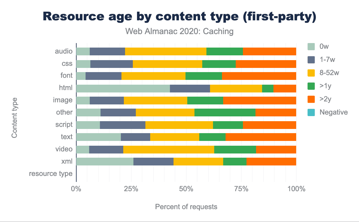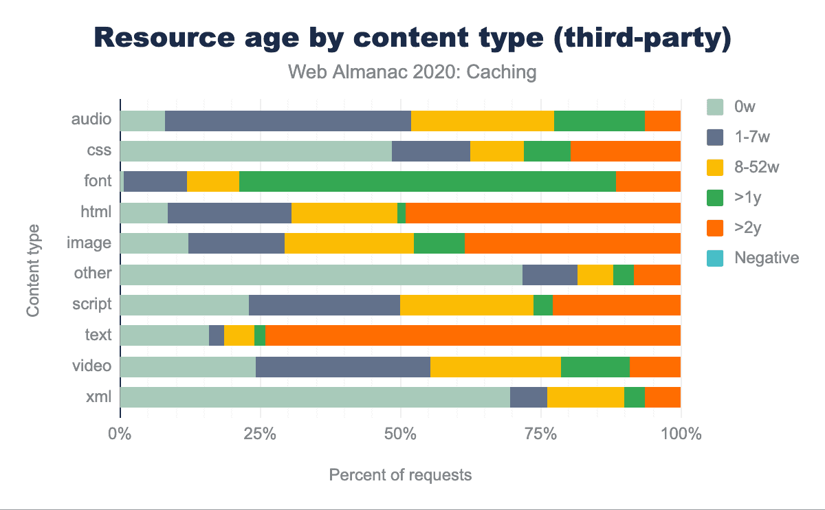 • ウェブ上のファーストパーティコンテンツのうち、8週間以上経過しているものには、images(78.9%)、scripts(68.7%)、CSS(74.9%)、Webフォント(80.4%)、autio(78.2%)、video(79.3%)など、伝統的にキャッシュ可能なオブジェクトがあります。
