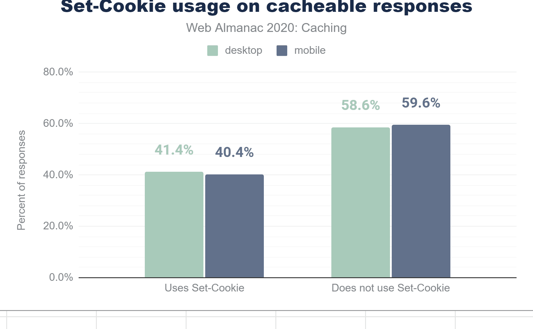 キャッシュ可能なモバイルレスポンスのうち、40.4%がSet-Cookieヘッダーを含んでいます。これらのレスポンスのうち、privateディレクティブを使用しているのは4.9%。残りの95.1%(1億9,860万のHTTPレスポンス)は、少なくとも1つのSet-Cookieレスポンスヘッダーを含んでおり、CDNなどのパブリックキャッシュサーバでキャッシュできます。これは、キャッシュ機能とCookieがどのように共存しているのか、理解されていないことを示しているのかもしれません。