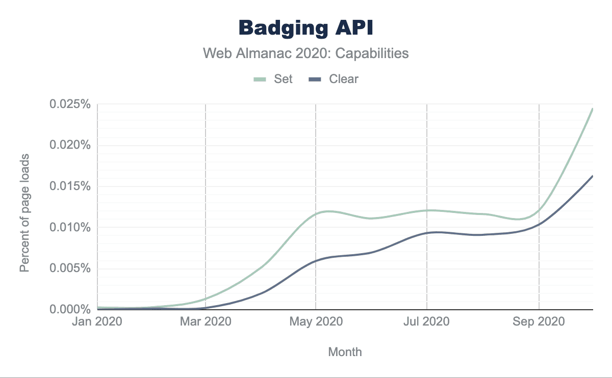 2020年4月にはGoogle Chrome 81が新しいバッジAPIを提供し、7月にはMicrosoft Edge 84が続いた。ChromeがAPIを提供した後、利用件数は急増した。2020年10月、Google Chromeの全ページロードの0.025%でsetAppBadge()メソッドが呼び出される。clearAppBadge() メソッドが呼び出される頻度は低く、ページロードの約0.016%の間に呼び出されています。