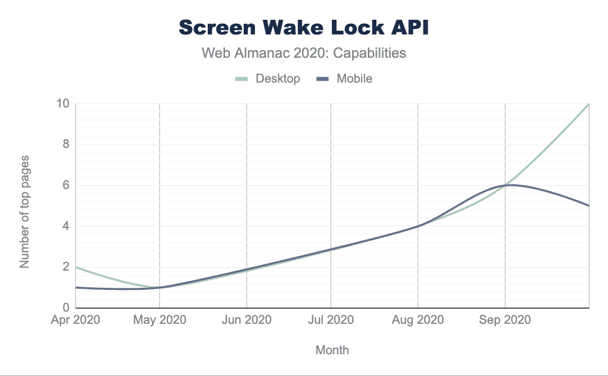 米国で人気の料理サイトBettyCrocker.comは、Screen Wake Lock APIの助けを借りて、料理中に画面が暗くなるのを防ぐオプションをユーザーに提供している。ケーススタディでは平均セッション時間が通常より3.1倍長くなり、バウンス率が50%減少し、購入意向指標が約300%増加したと発表しています。このように、インターフェイスは、Webサイトやアプリケーションの成功に直接的に測定可能な効果を持っています。Screen Wake Lock APIは、2020年7月にGoogle Chrome 84で提供されました。HTTP Archiveには4月、5月、8月、9月、10月のデータしかありません。Chrome 84のリリース後、利用率は一気に上昇しました。2020年10月には、デスクトップ10ページ、モバイル5ページでAPIが採用されました。