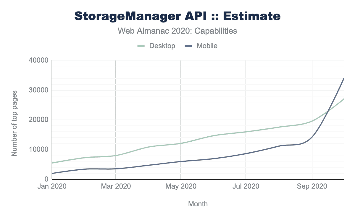 Storage Manager APIは2016年からChrome、2017年からFirefox、そして新しいChromiumベースのEdgeでサポートされています。HTTP Archiveのデータによると、デスクトップページ27,056ページ(0.49%)とモバイルページ34,042ページ(0.48%)でAPIが使用されています。2020年の間に、Storage Manager APIの使用率は増加の一途をたどっています。このことからも、この章では、このインターフェイスが最もよく使われているAPIとなっています。