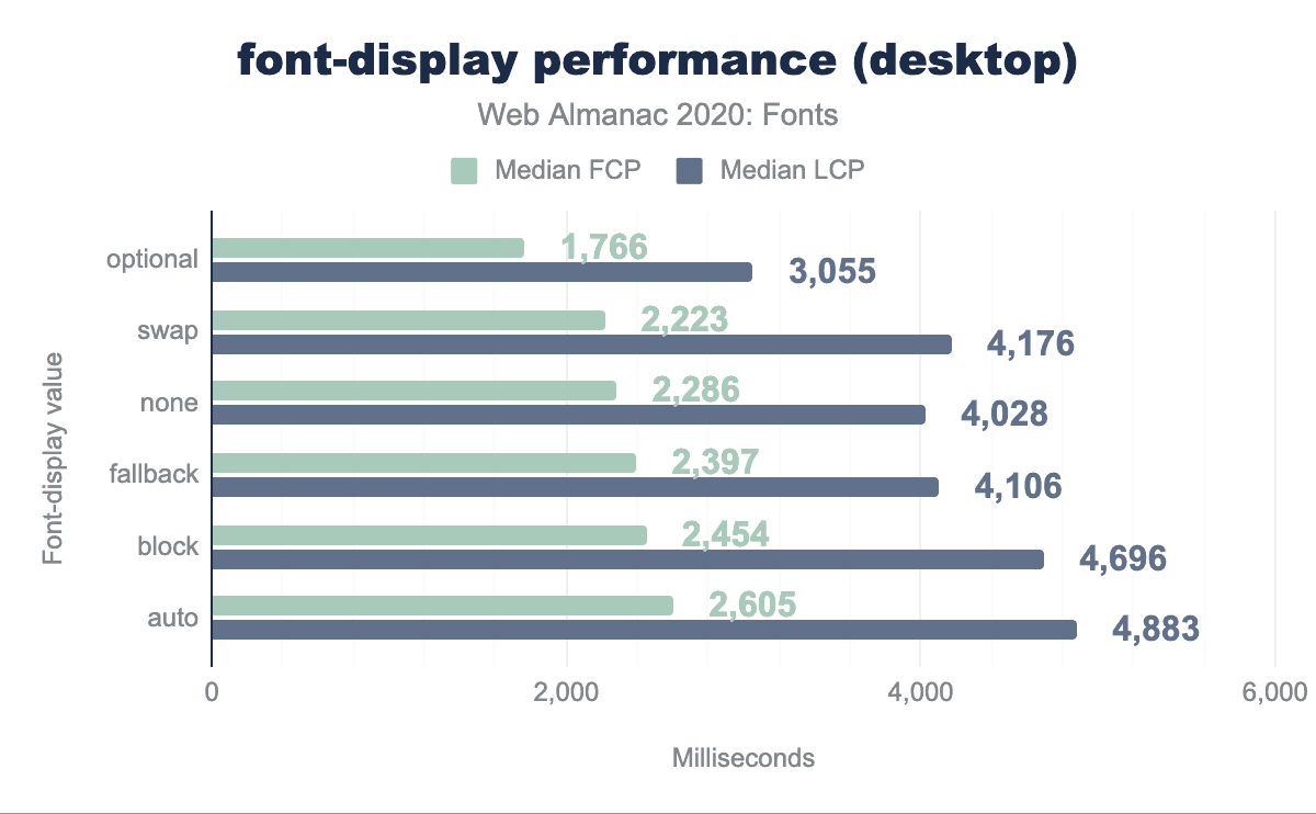 このデータからは、他にも2つの興味深い推論があります。blockの設定は、とくにモバイルではFCPに大きな影響を与えると予想されますが、実際にはその効果はそれほど大きくありません。これは、フォントアセットの待ち時間がWebページ全体のパフォーマンスを制限する要因になることはほとんどないことを示唆していますが、画像などのリソースが多くないページでは大きな要因になることは間違いありません。autoの設定(指定しなかった場合の設定)は、ブラウザ次第です。デフォルトではほとんどの場合にブロックされますので、blockとよく似ています。